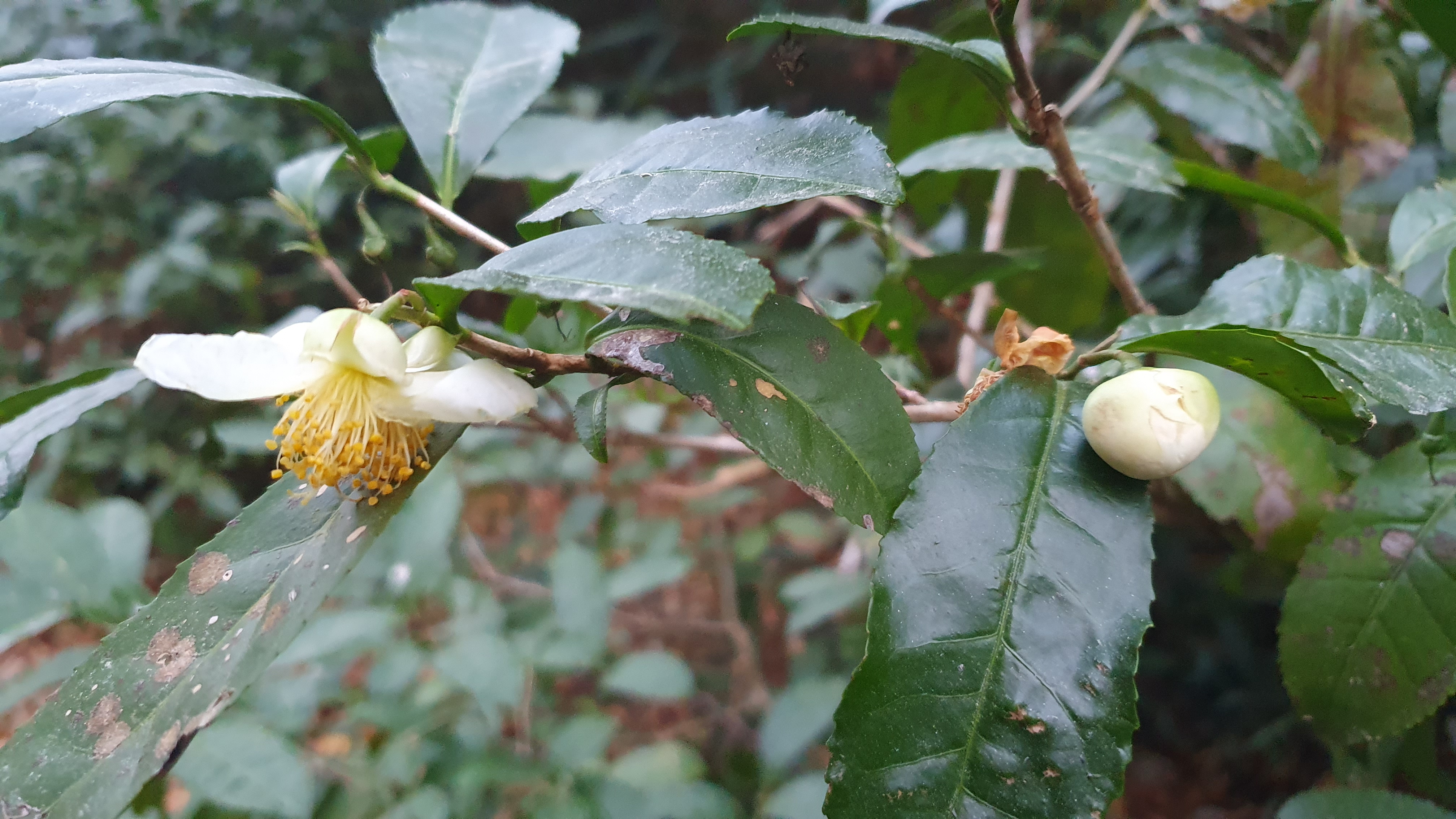 ▲ 차나무과 동백나무속의 차나무. 사찰 근처에는 차나무 밭이 많이 있다. 꽃도 피고 열매도 열려 있다. 두꺼운 잎, 커다란 꽃잎과 풍성한 수술, 삭과 열매 등 동백나무와 비슷한 특징들이 많다. 꽃도 추위가 다가오는 이맘때 늦가을에 피는 모양이다.