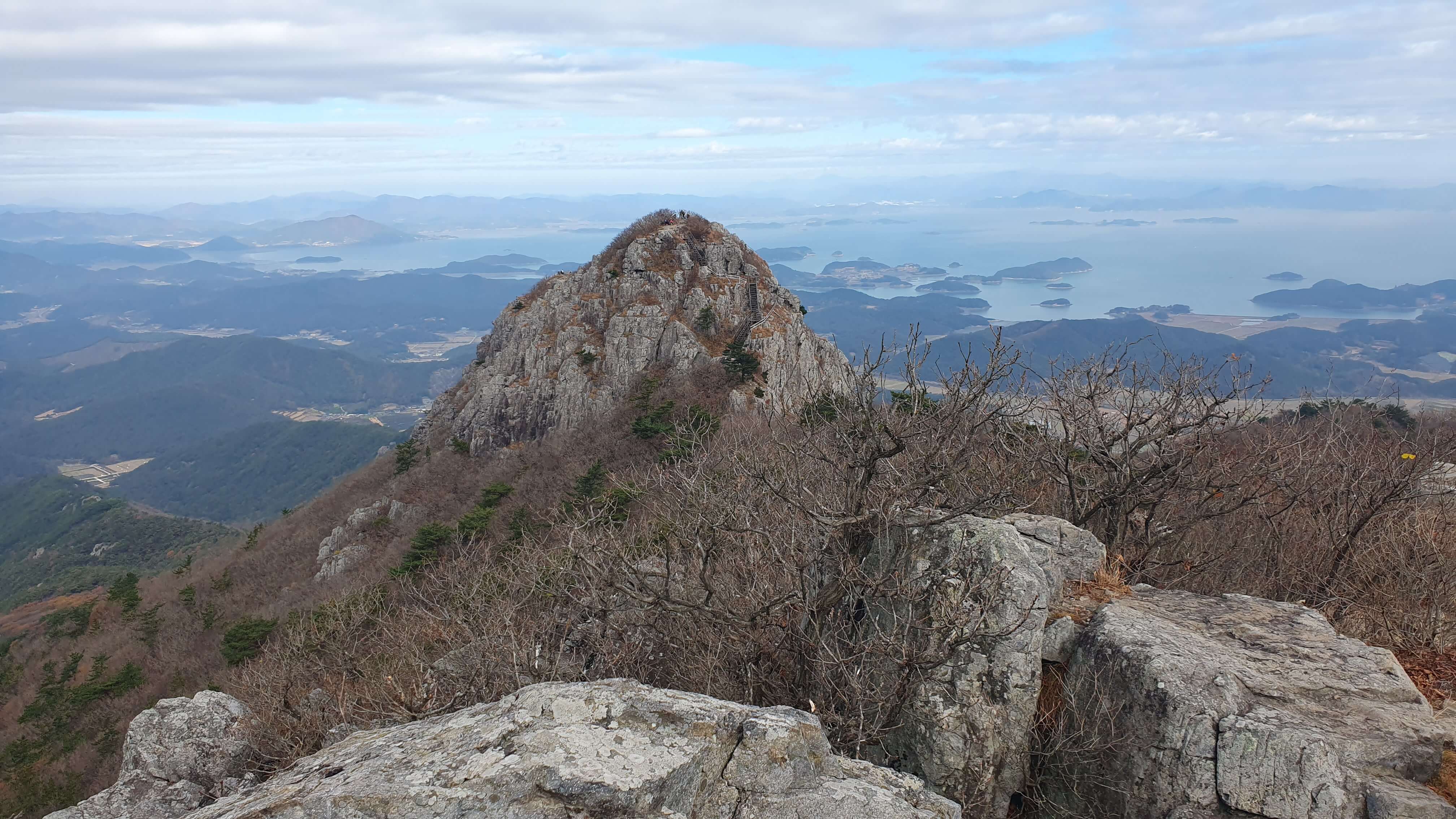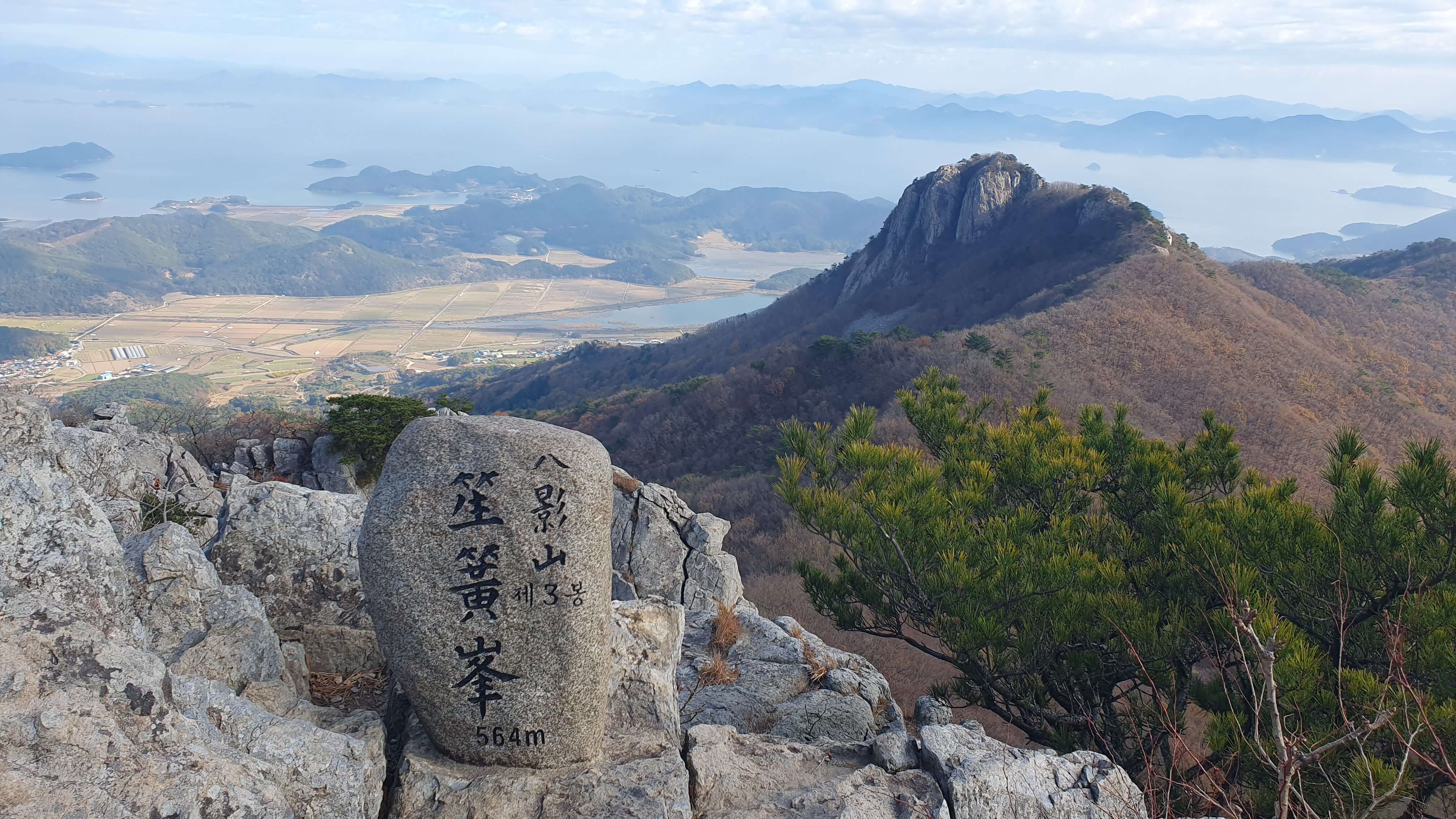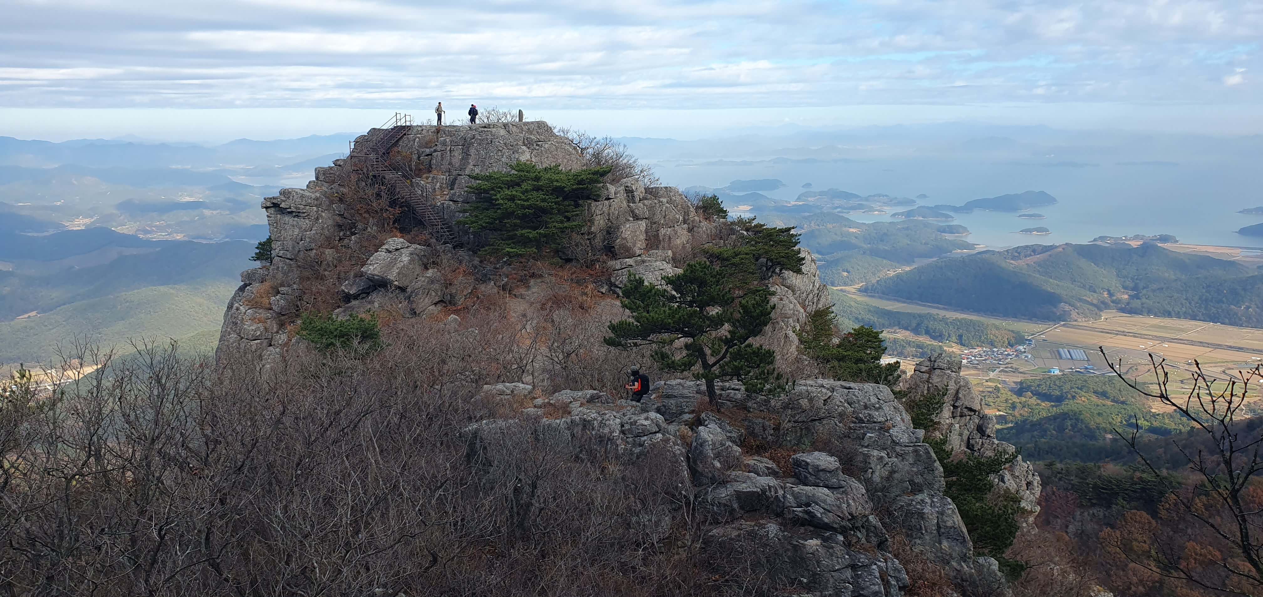 ▲ 8봉은 아니지만 10 봉에 포함되는 선녀봉과 남해 다도해를 배경으로 우뚝 솟은 바위 봉우리 정상은 넓고 평평하다.
