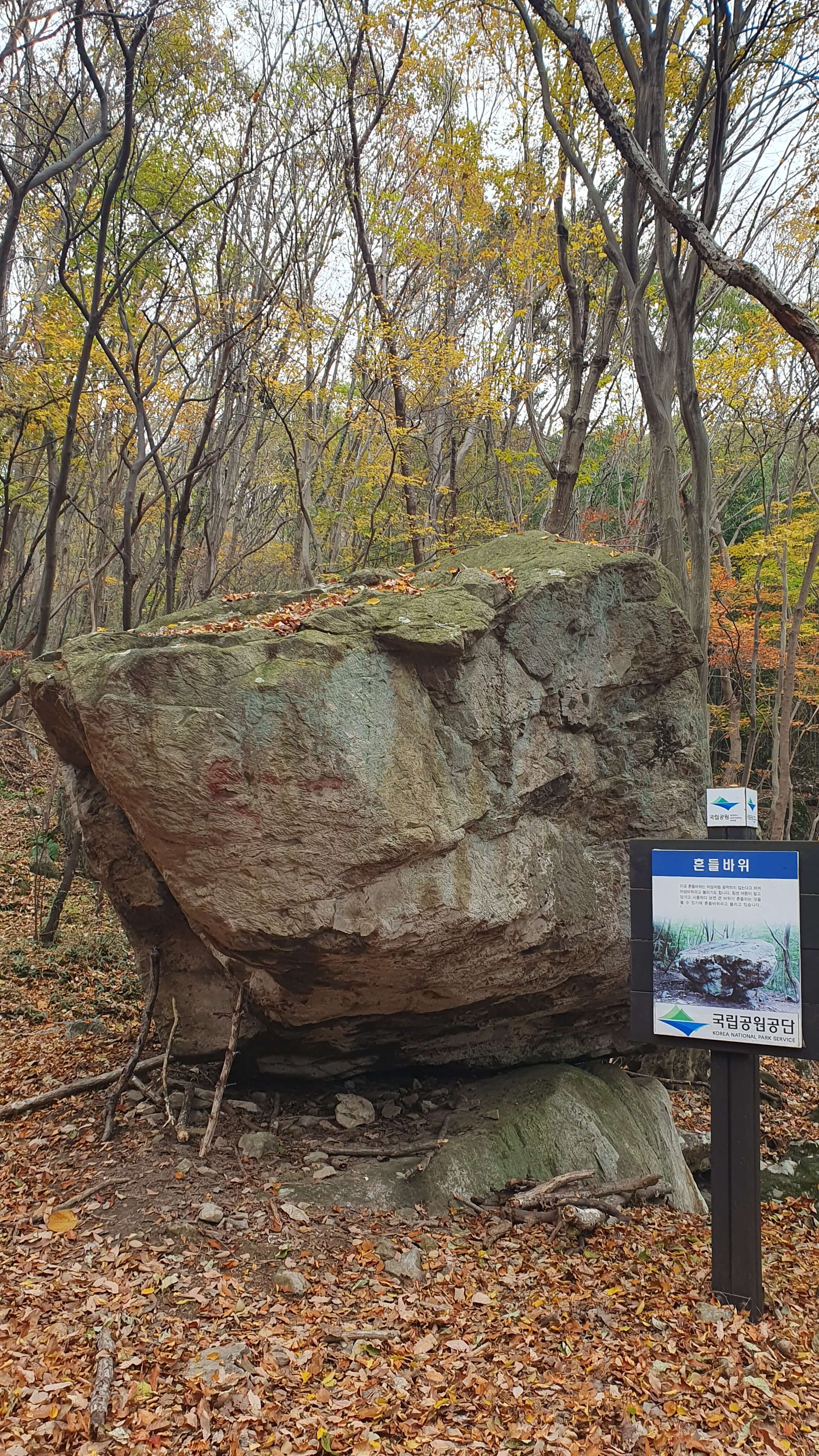 ▲ 주차장에서 1 km 정도 오르막을 오르면 한 숨 돌릴 수 있는 흔들바위 공터가 나온다. 팔영산 흔들바위는 흔들리지 않는다.
