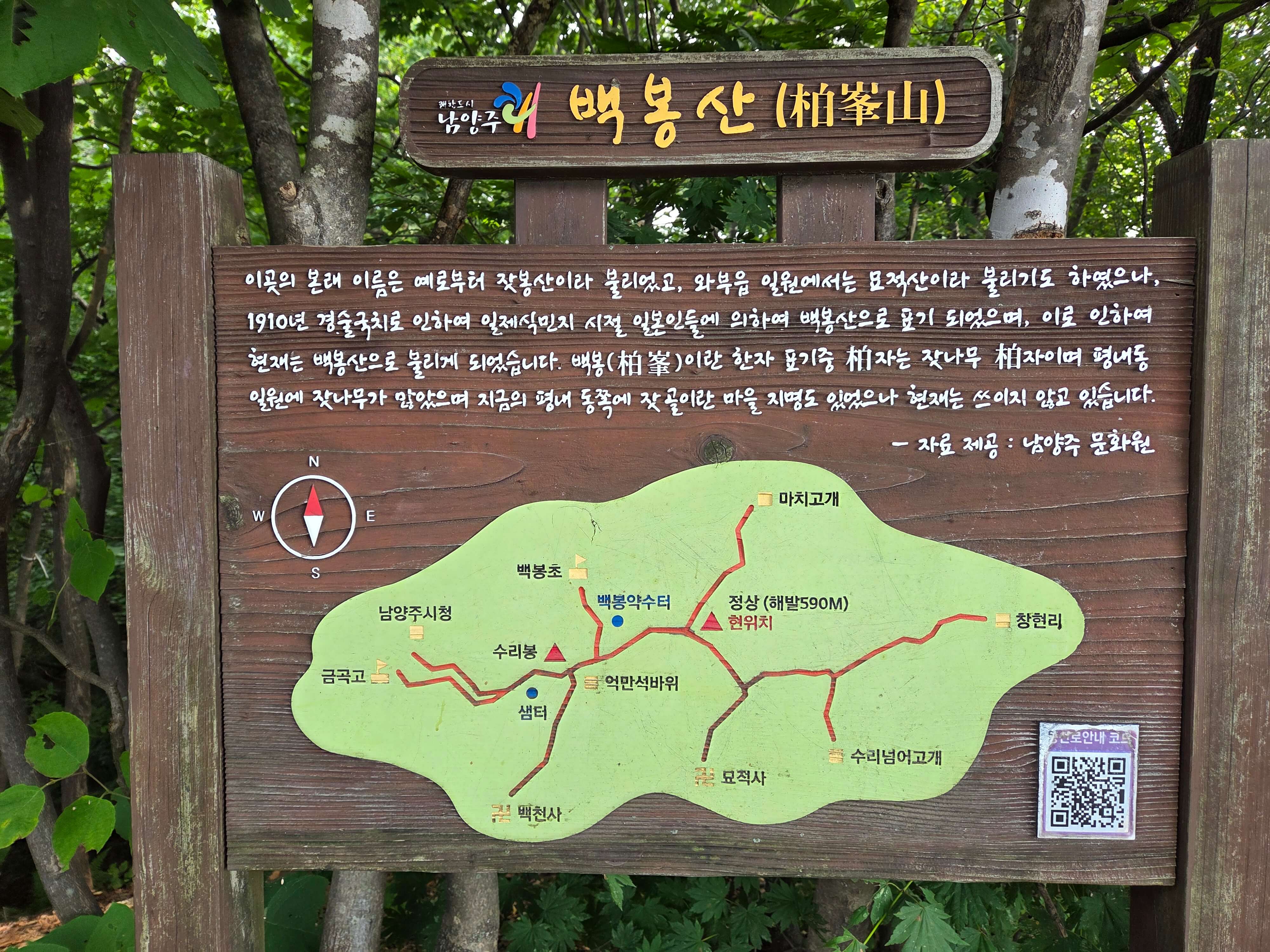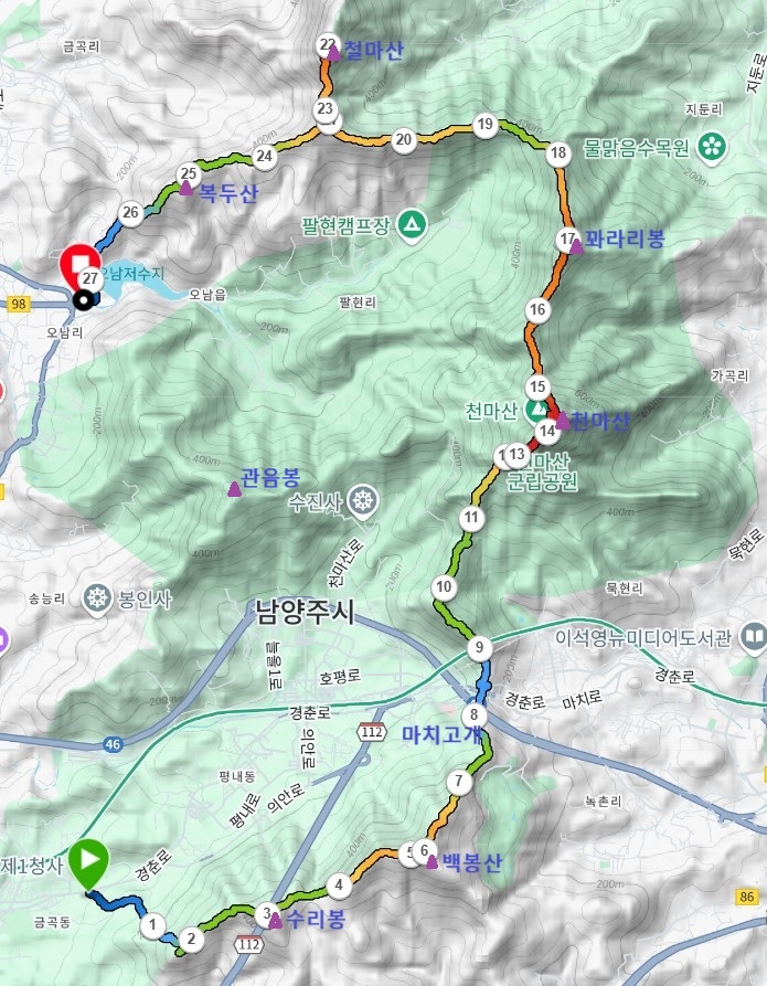 - 산행경로 : 남양주시청1청사 주차장- 수리봉 (482m, ~ 2.7km) - 백봉산 (587m, ~ 2km) - 마치고개 (230m, ~ 4.7 km) - 천마산 (812m, ~ 3.3km) - 멸도봉 - 꽈라리봉 (675m, ~ 2.4 km) - 수동터널 위 - 철마산 (711m, ~ 4.9km) - 복두산 (410m) - 오남저수지 ( ~ 4.5 km) (버스로 원점회귀)