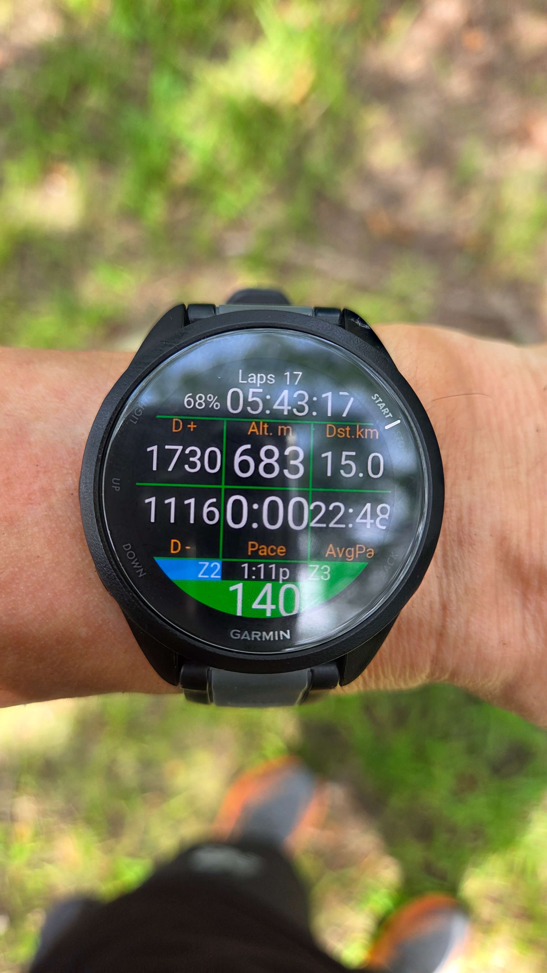 ▲ 꽈라리봉은 별다른 표시가 없고 이정표만 있다. 이정표 아래 누군가 과라리봉이라고 새겨 놓았다. 천마산에서 2.4 km를 왔다. 철마산까지 4.9km를 가야 한다. 가민시계는 해발 683m, 15km 를 왔다고 표시하고 있다.