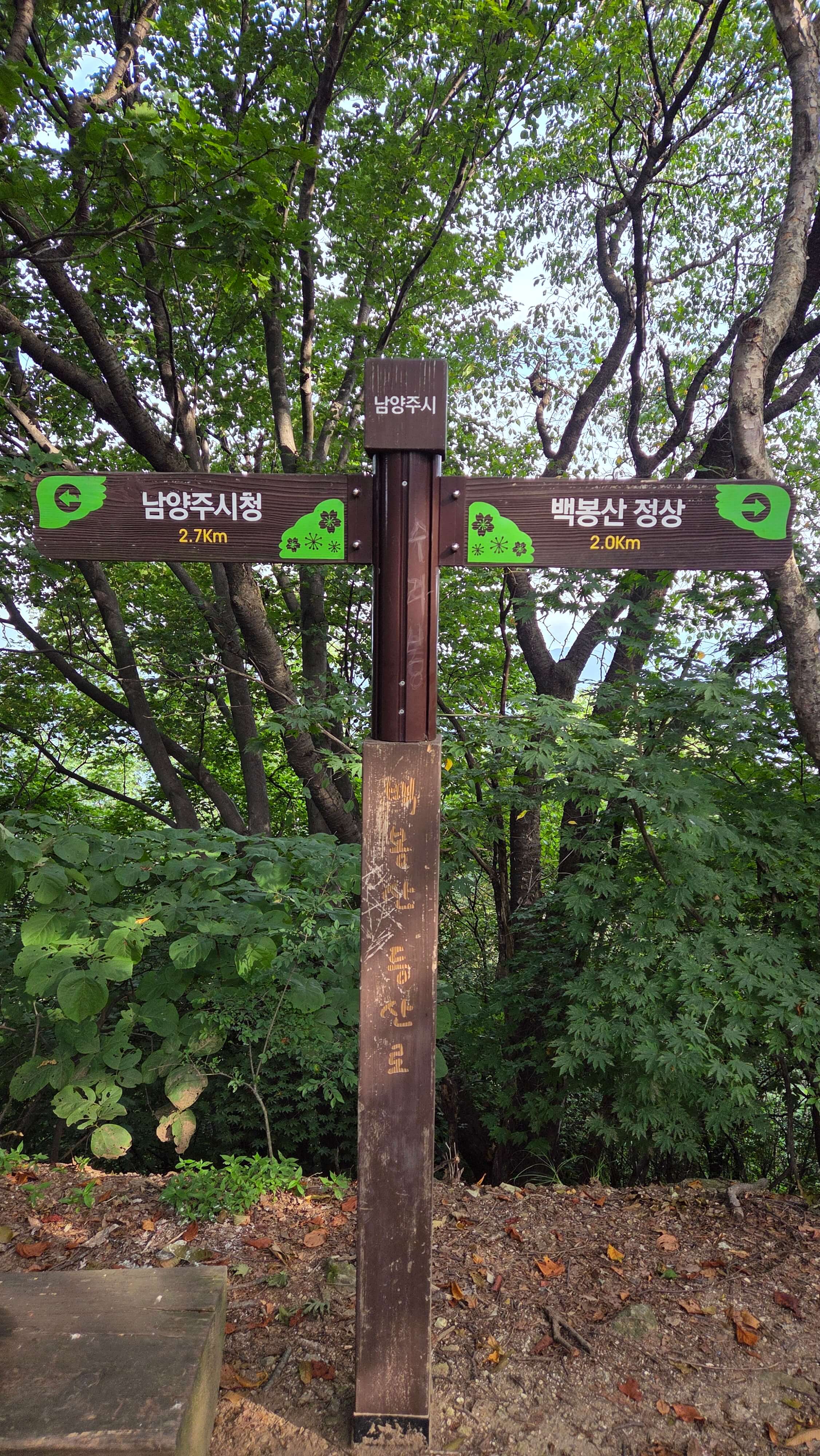 남양주시 1청사에 주차한다. 주차장은 거의 비어 있다. 휴일과 야간은 무료이다. 길만 건너면 백봉산 들머리다. 하산은 오남저수지로 내려와서 버스로 여기로 복귀할 예정이다. 백봉산까지는 제법 경사가 있다. 그러나 길은 잘되어 있어서 걷기에 좋다. 동네 어르신들도 가벼운 차림으로 아침 일찍 다녀오시는 분들이 많이 보인다. 백봉산 정상에는 꽤 높은 전망대가 있어서 사방 경치를 둘러 보기에 좋다.