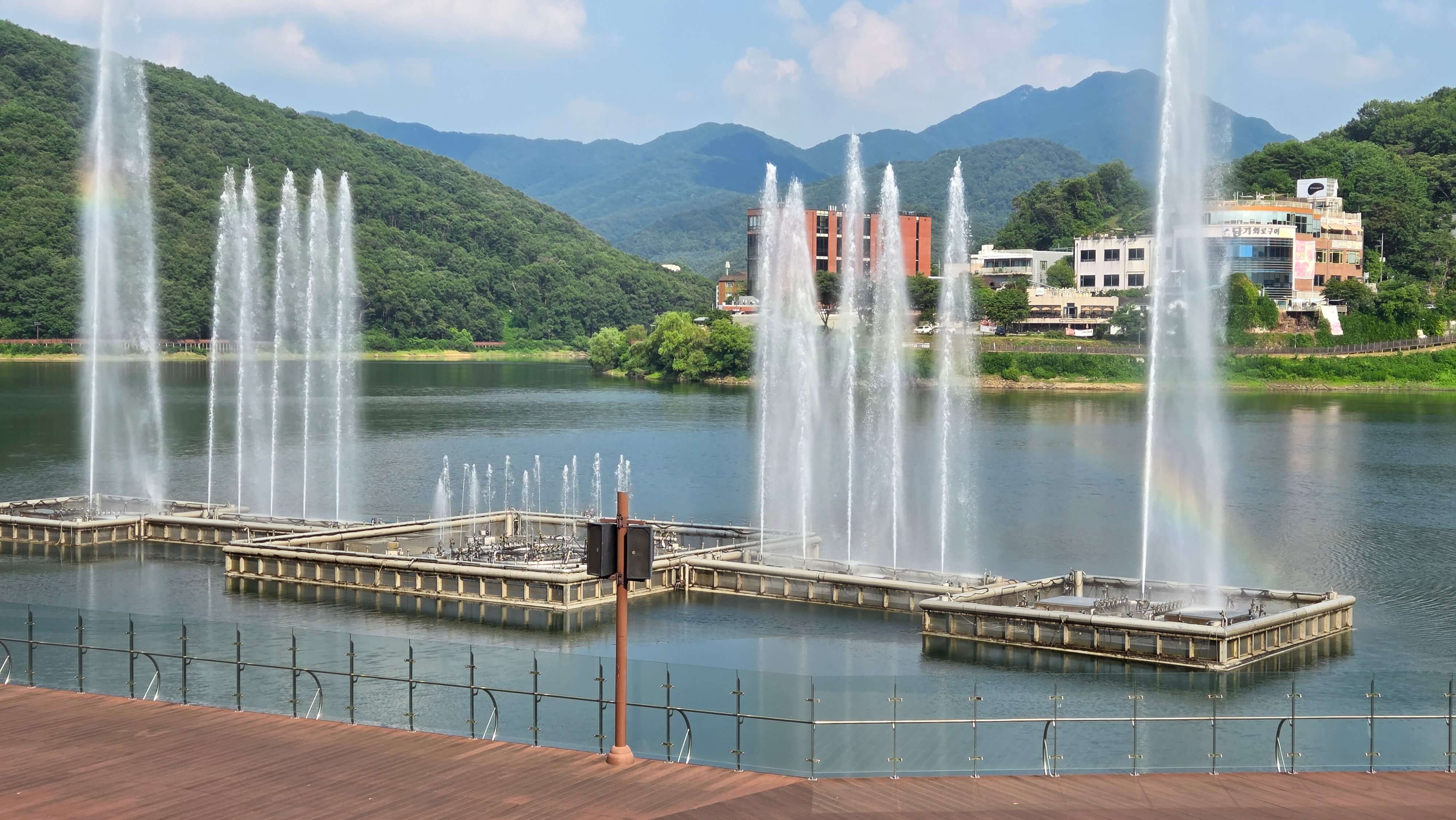 ▲ 분수를 설치하여 제법 분위기를 내고 있다. 날씨가 너무 더운 탓인지 개미 한마리 보이지 않는다. 저 뒤로 천마산 정상이 보인다.