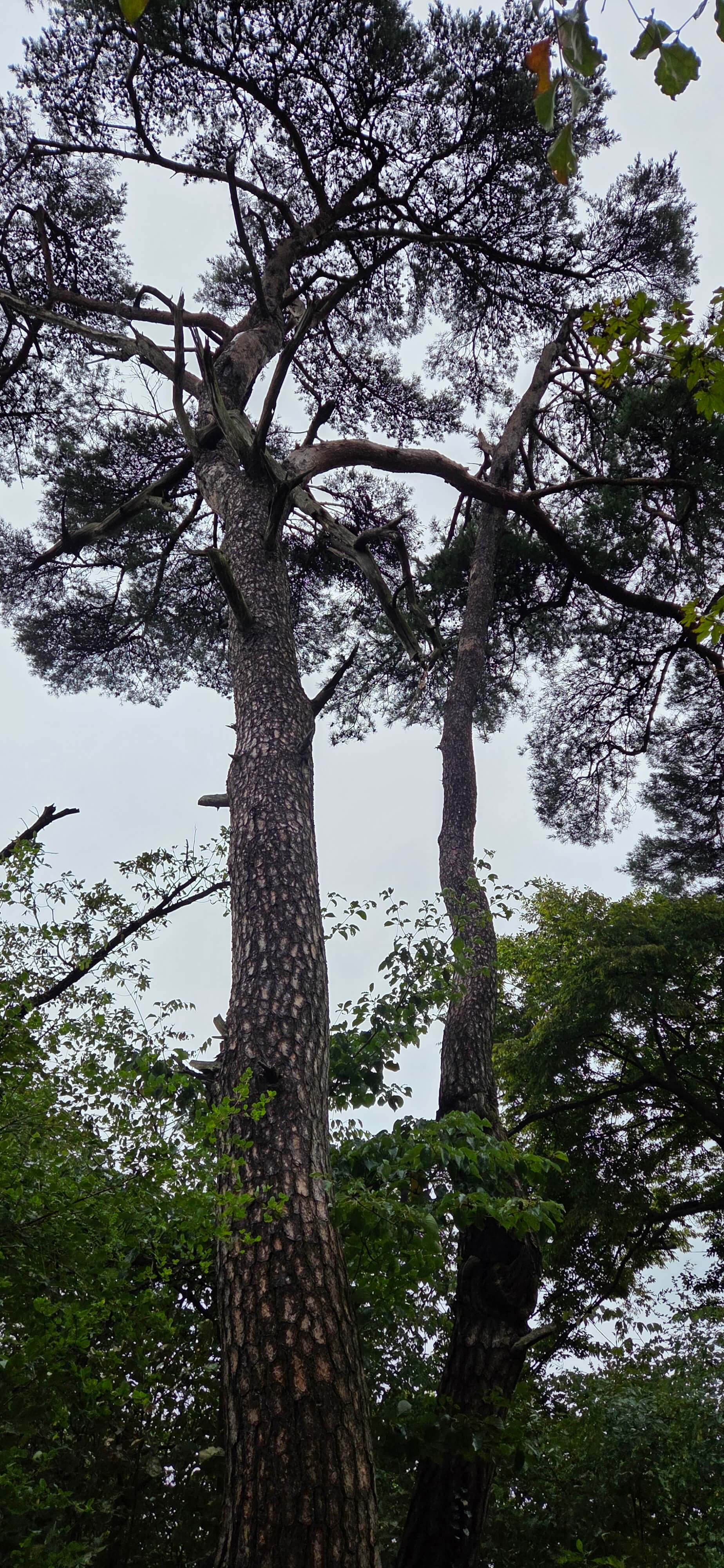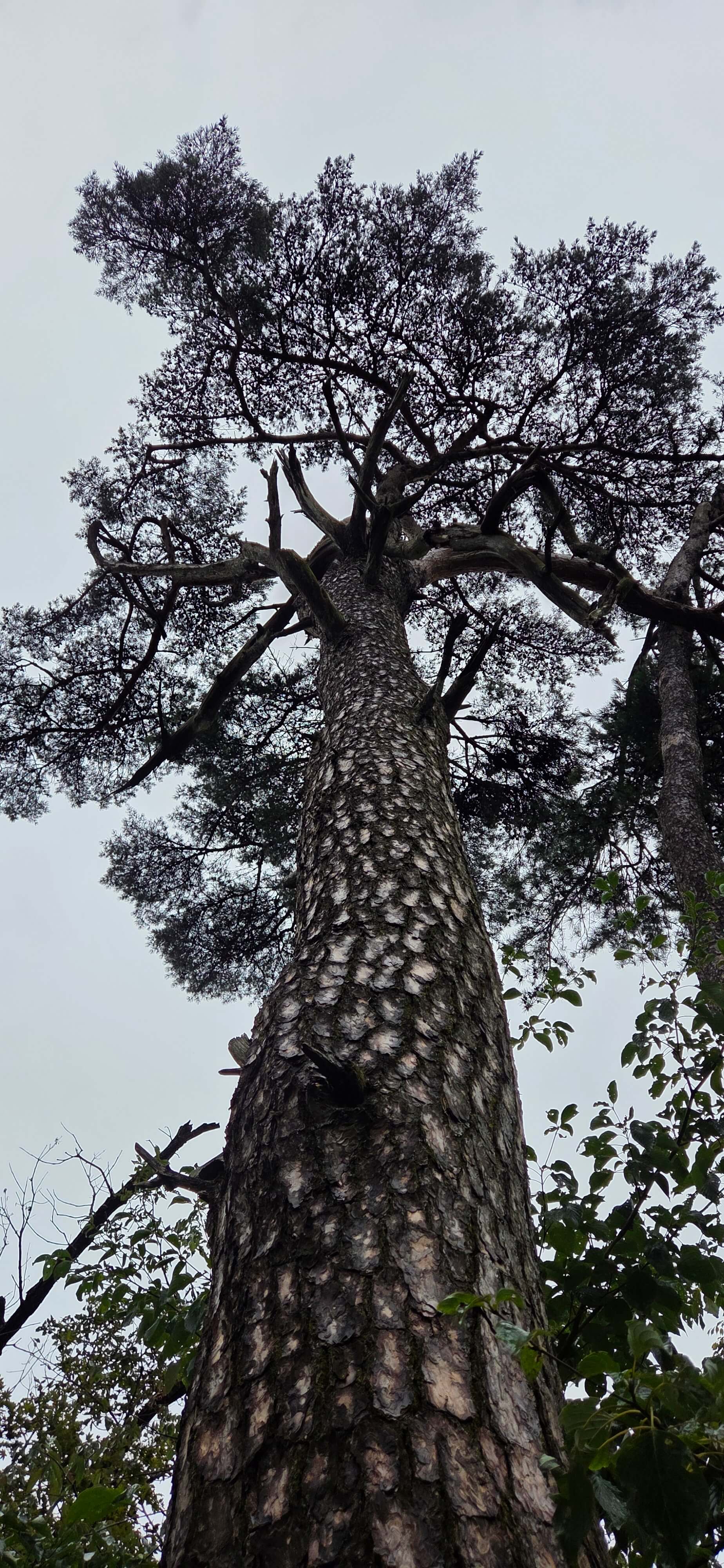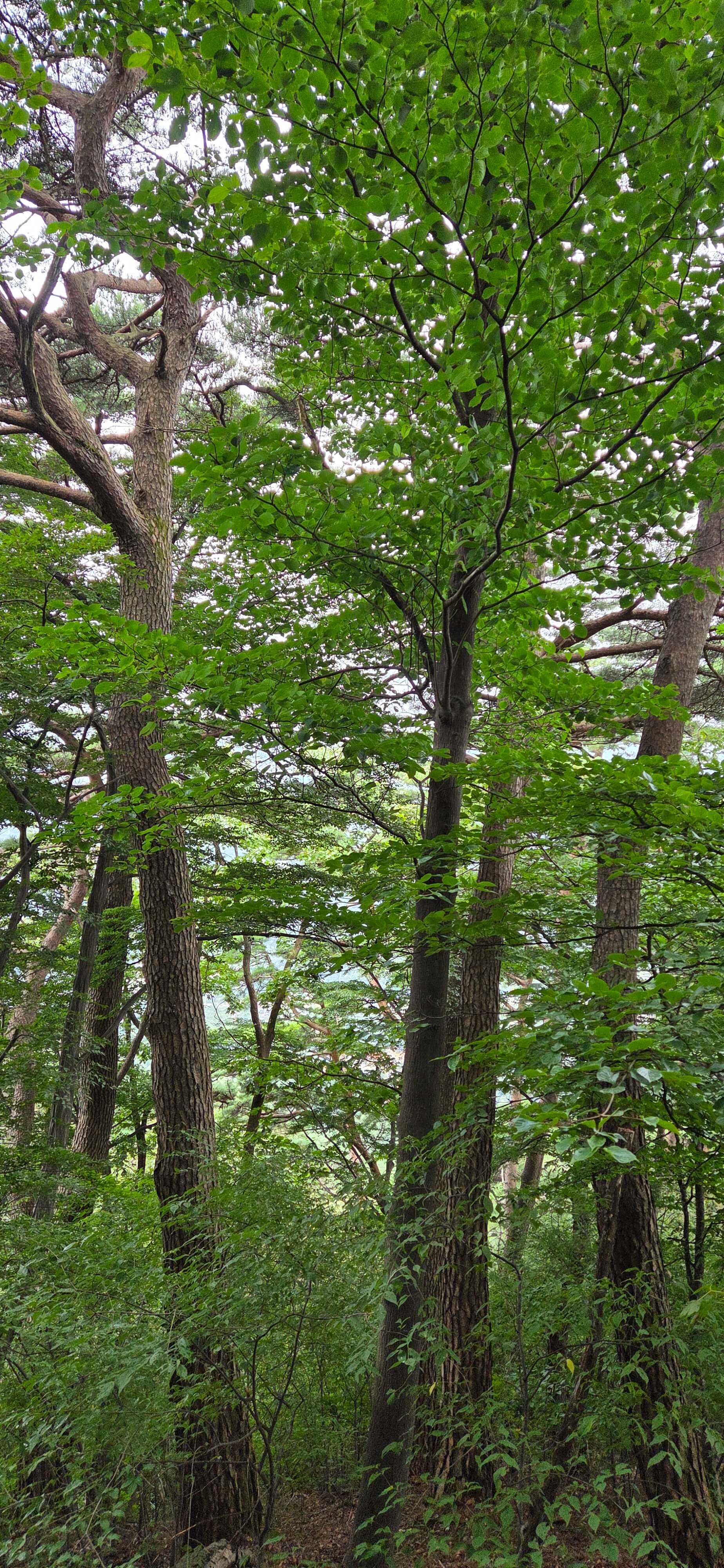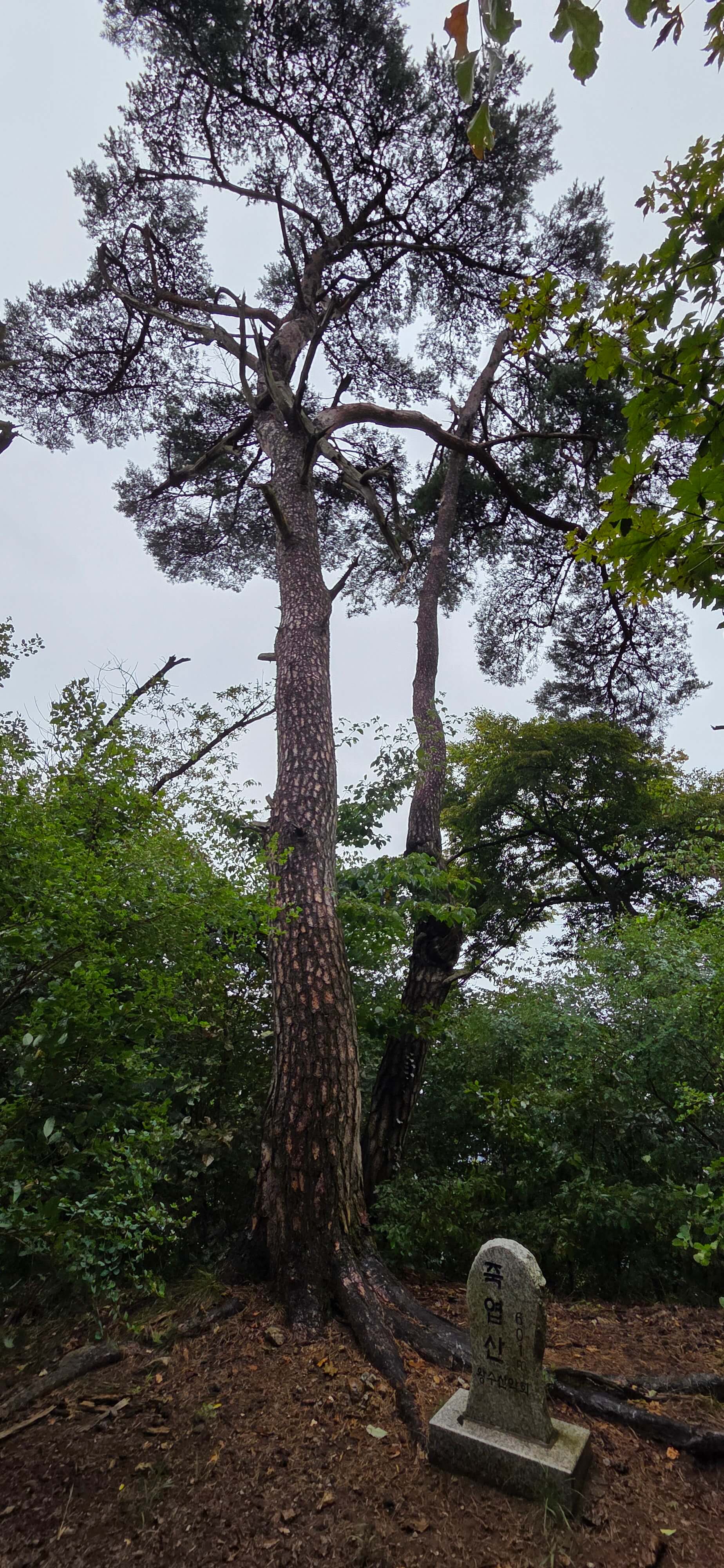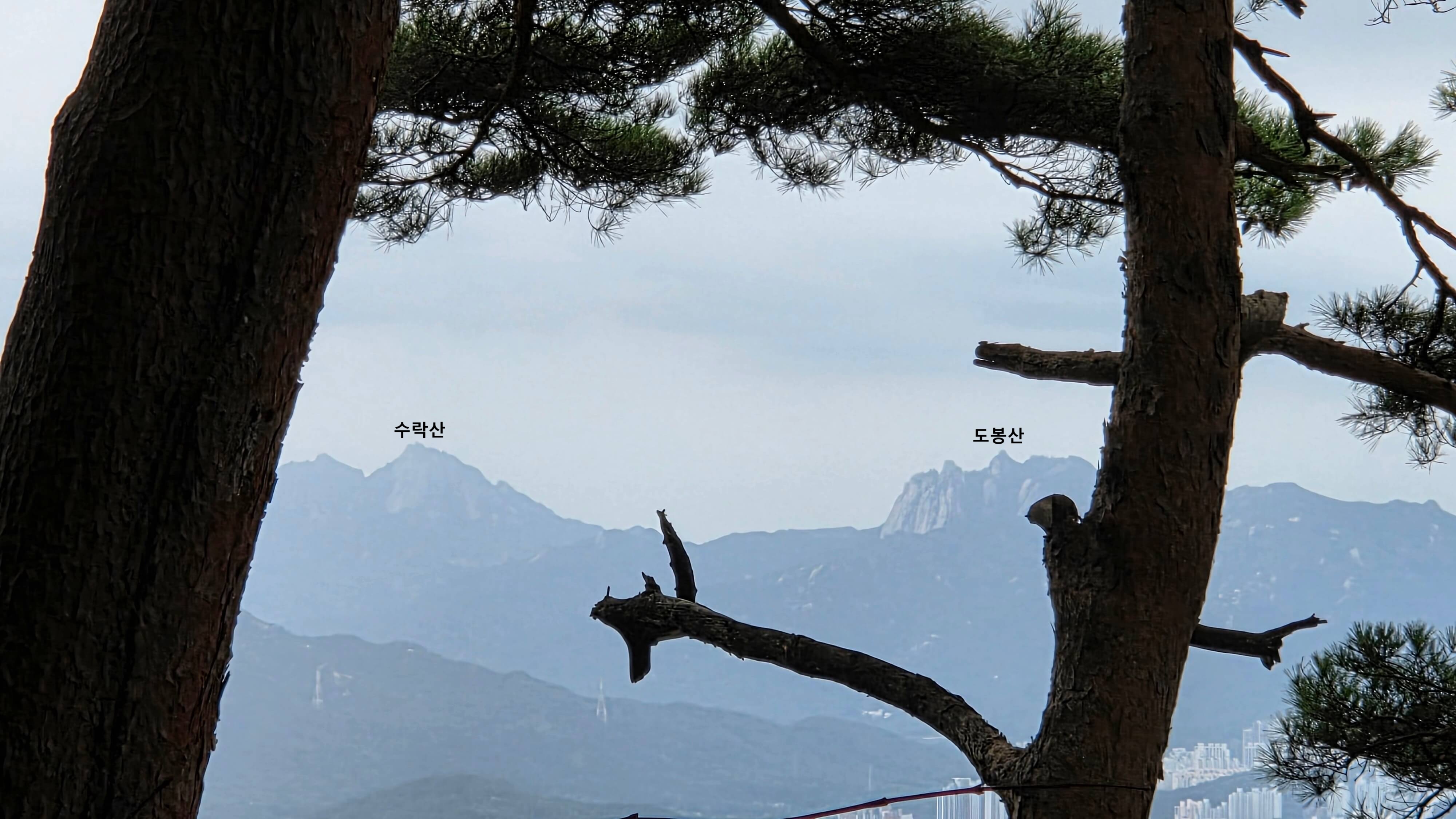 주변의 산들과 지형을 집에서 보는 뷰와 비교해 보려던 생각은 오늘도 여지 없이 무너진다. 내려 오는 길에 잠깐 구름이 걷혀 소나무 고목들 사이로 멀리 도봉산과 수락산 정상이 어렴풋이 보인다.