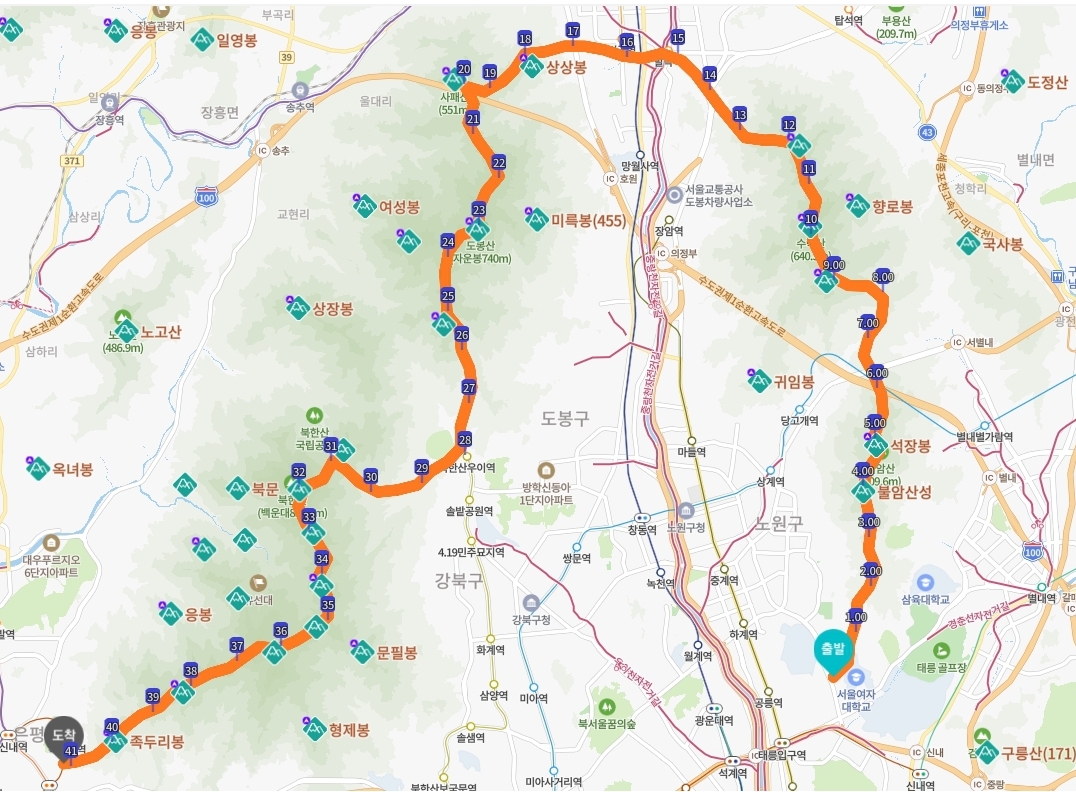 불수사도북은 수도권 강북 5산을 종주하는 산행 코스인데 종주 산행, 트레일 러닝 코스로 인기가 높다. 전체 길이가 45 Km 전후이다. 이 코스를 연속으로 왕복 또는 3회전 하는 철인들도 있다.