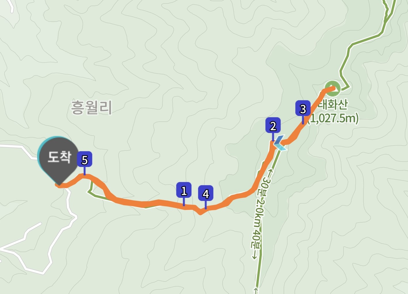 흥교태화산농장 코스는 편도 2.5 km 거리이고, 들머리 고도가 550m 이기 때문에 정상까지 470 m 만 올리면 된다. 경사가 심하지 않고 위험한 구간도 없는 평이한 육산이기 때문에 가볍게 다녀올 수 있다. 이 날 산행객들도 대부분 오전에 산행을 마치고 돌아가는 팀들이었다.