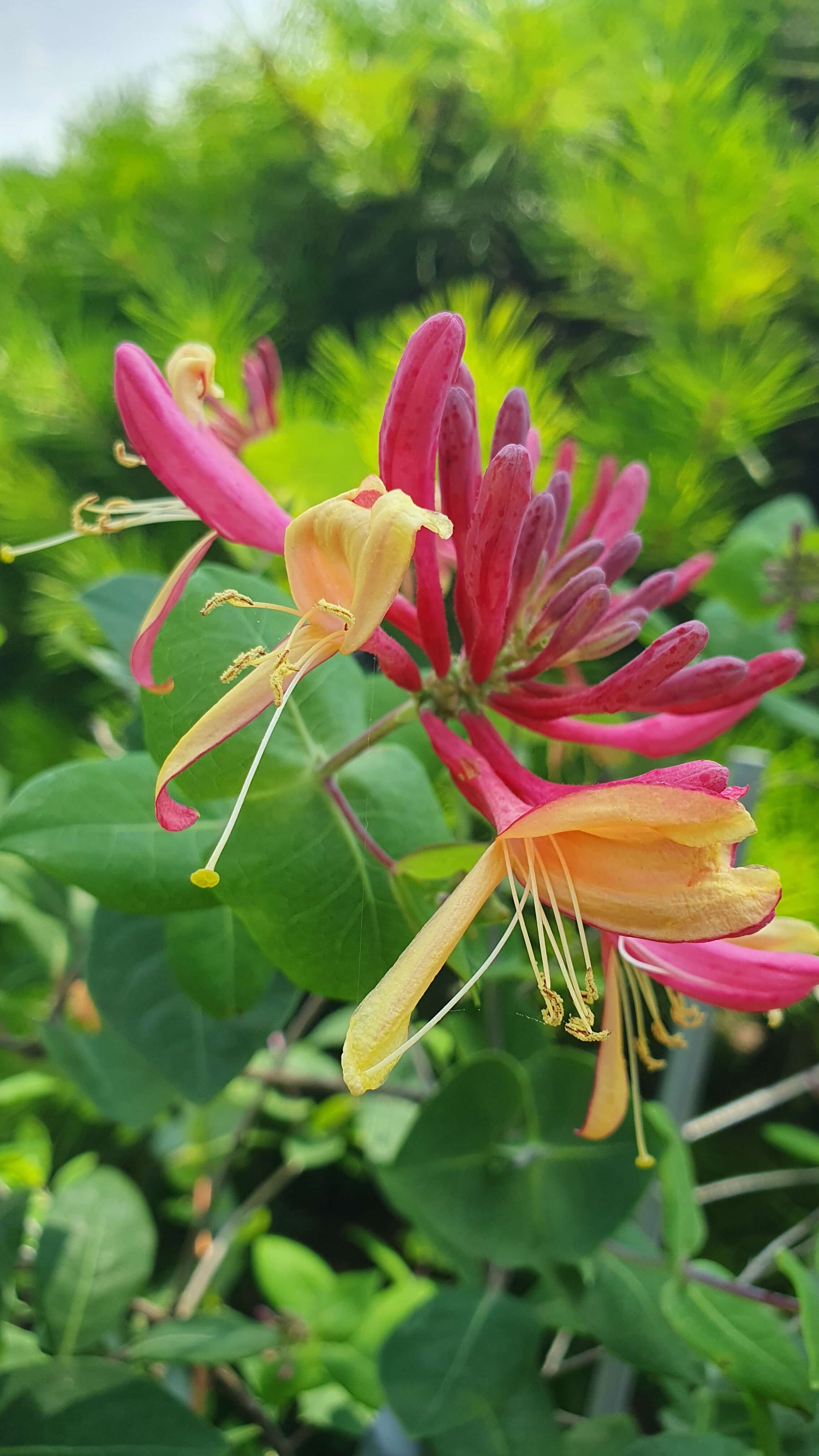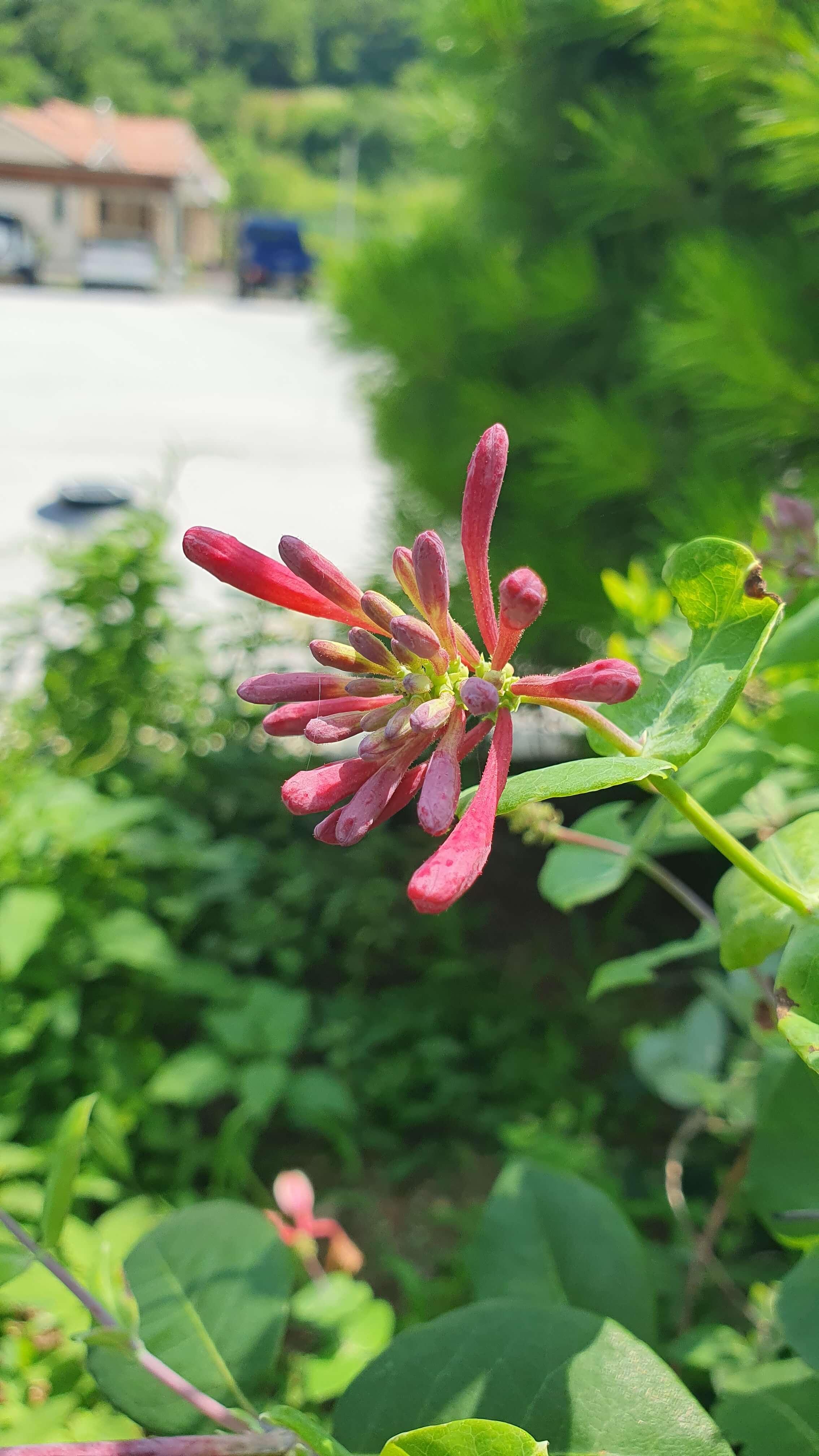 산 아래 어느 집 담장을 붉은인동이 장식하고 있다. 붉은색 외피와 노랑색 내피의 대비가 색다르다.