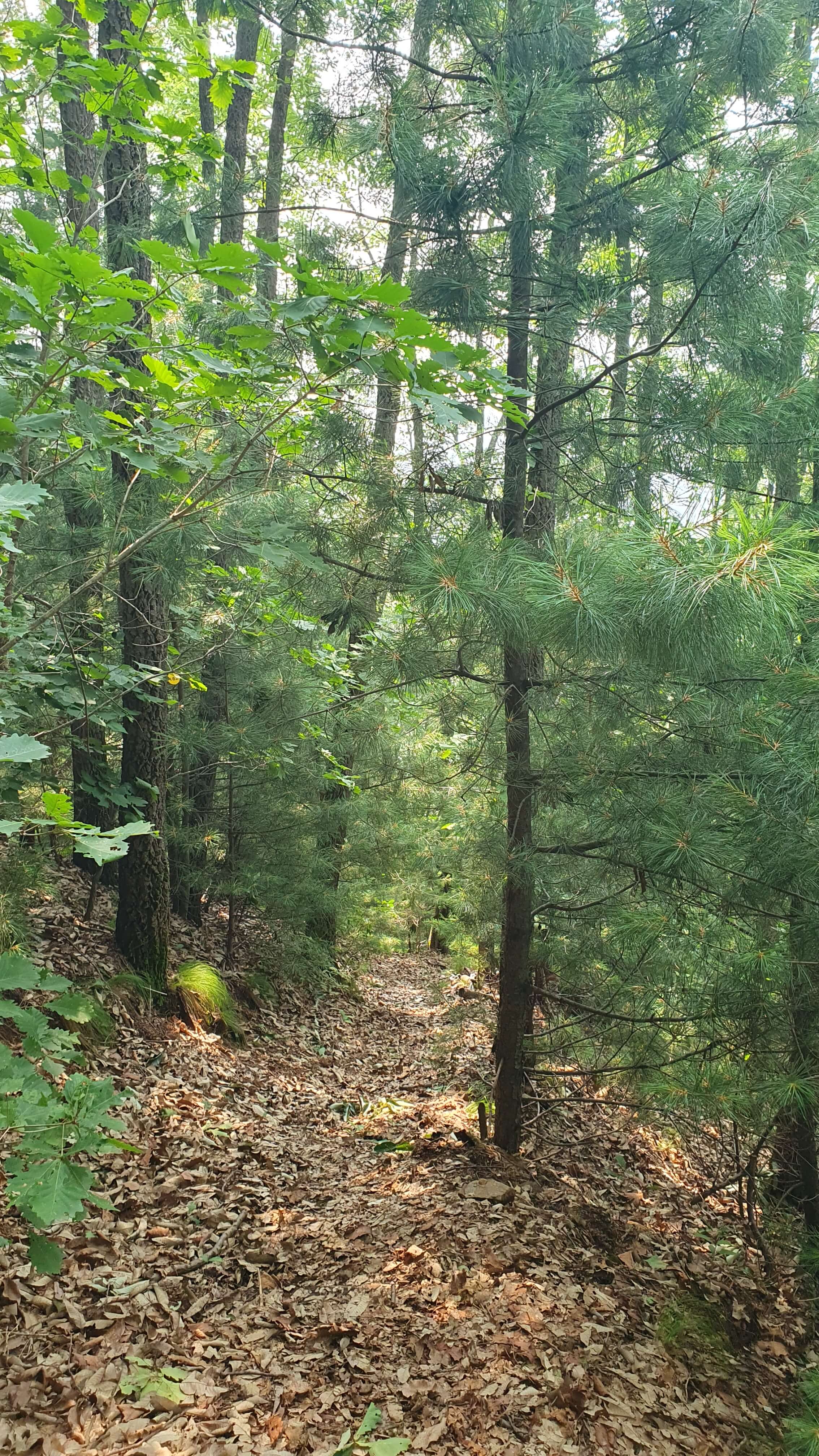하산 길에 만난 잣나무 숲. 나란히 줄 서 있는 것을 보면 인공조림한 듯하다. 바닥에 풀이 자라지 못해 황량하다는 느낌이다.