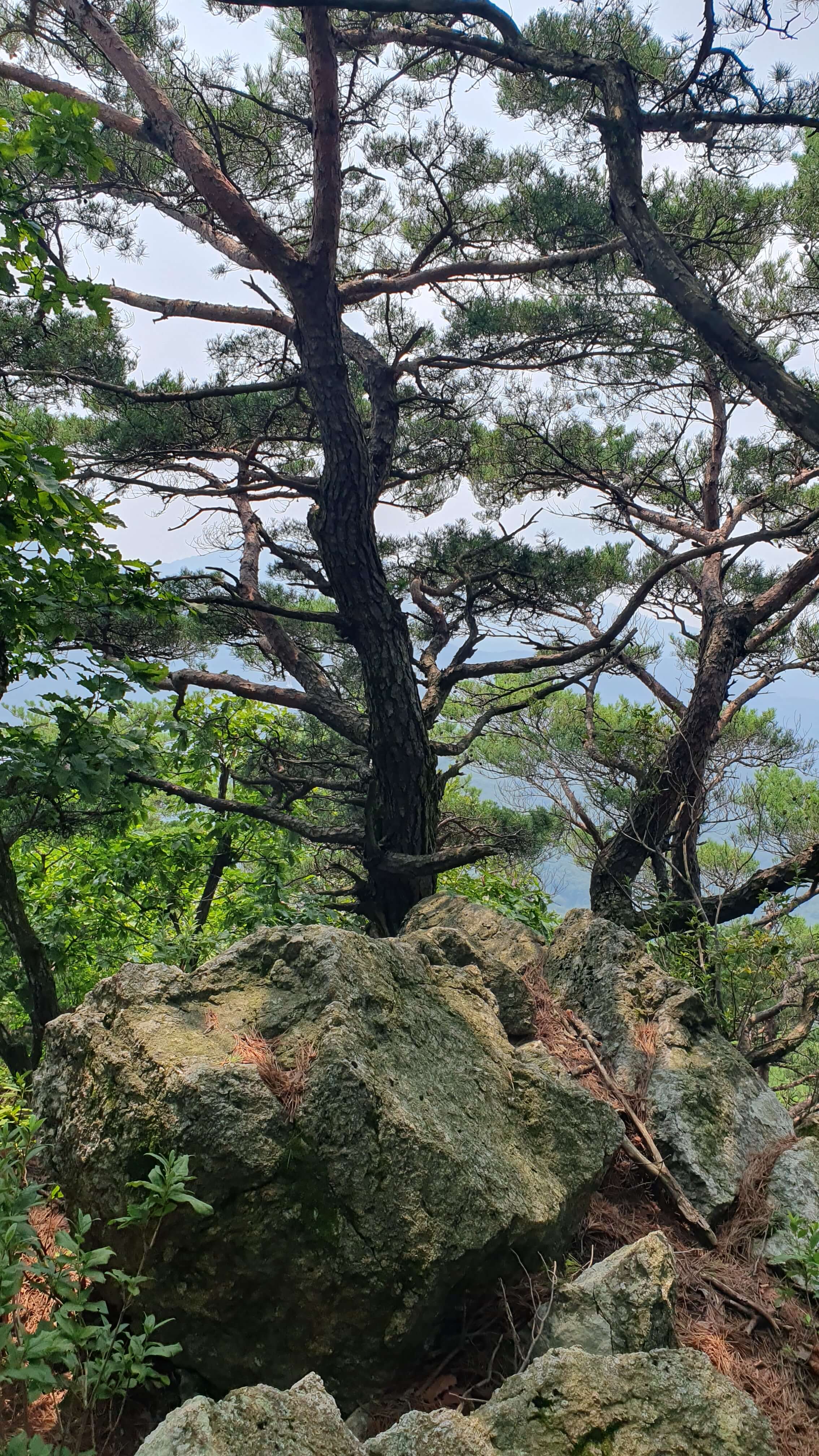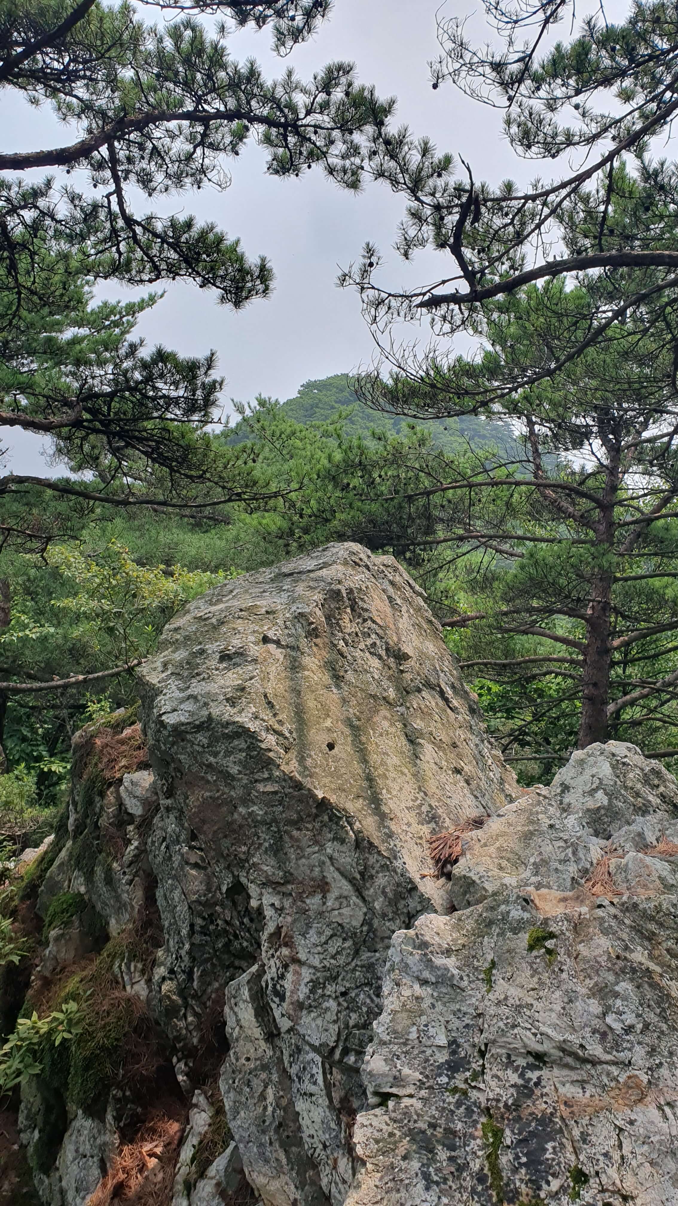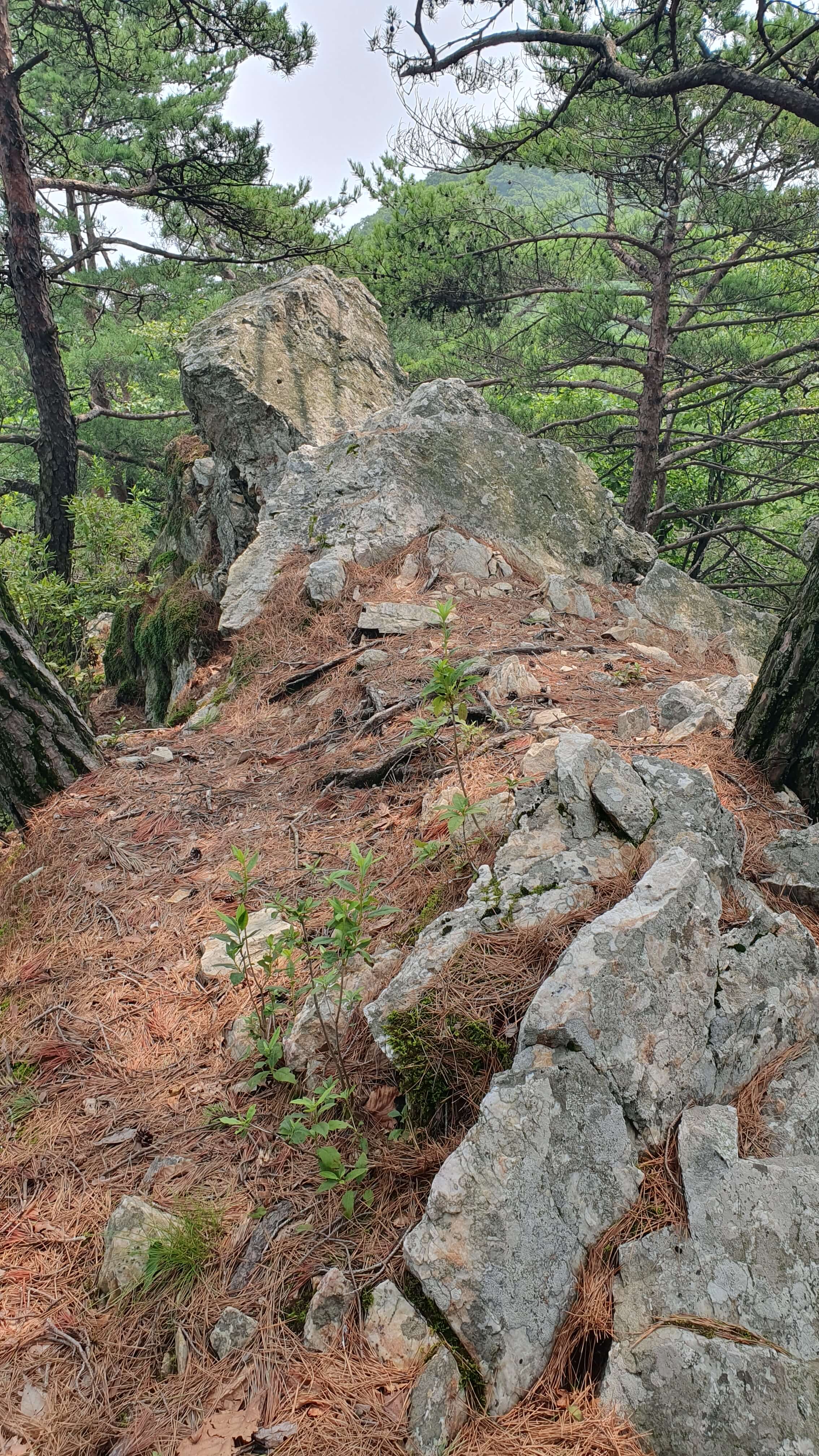 정면에 멋진 바위 봉우리가 보이는데 등산로는 옆으로 돌아가도록 되어 있다. 참새가 방앗간을 그냥 지나칠 수는 없다. 바위 능선을 타고 오른다. 봉우리 끝 바위에 올라서려는데 뱀이 또아리를 틀고 나를 노려보고 있다. 하마터면 못보고 밟을 뻔 했다. 꿈쩍도 하지 않는 것이 도망갈 생각이 전혀 없어 보인다. 오히려 '여긴 내 자리야 올 생각 마' 하는 것 같다. 할 수 없이 자리를 양보하고 돌아 선다. 계속 가면 옆길로 돌아오는 길과 만날 것으로 예상했는데 더 이상 길이 없다. 절벽이다. 작전상 후퇴다. 나중에 오시는 분이 있다면 방앗간은 그냥 지나치시길.