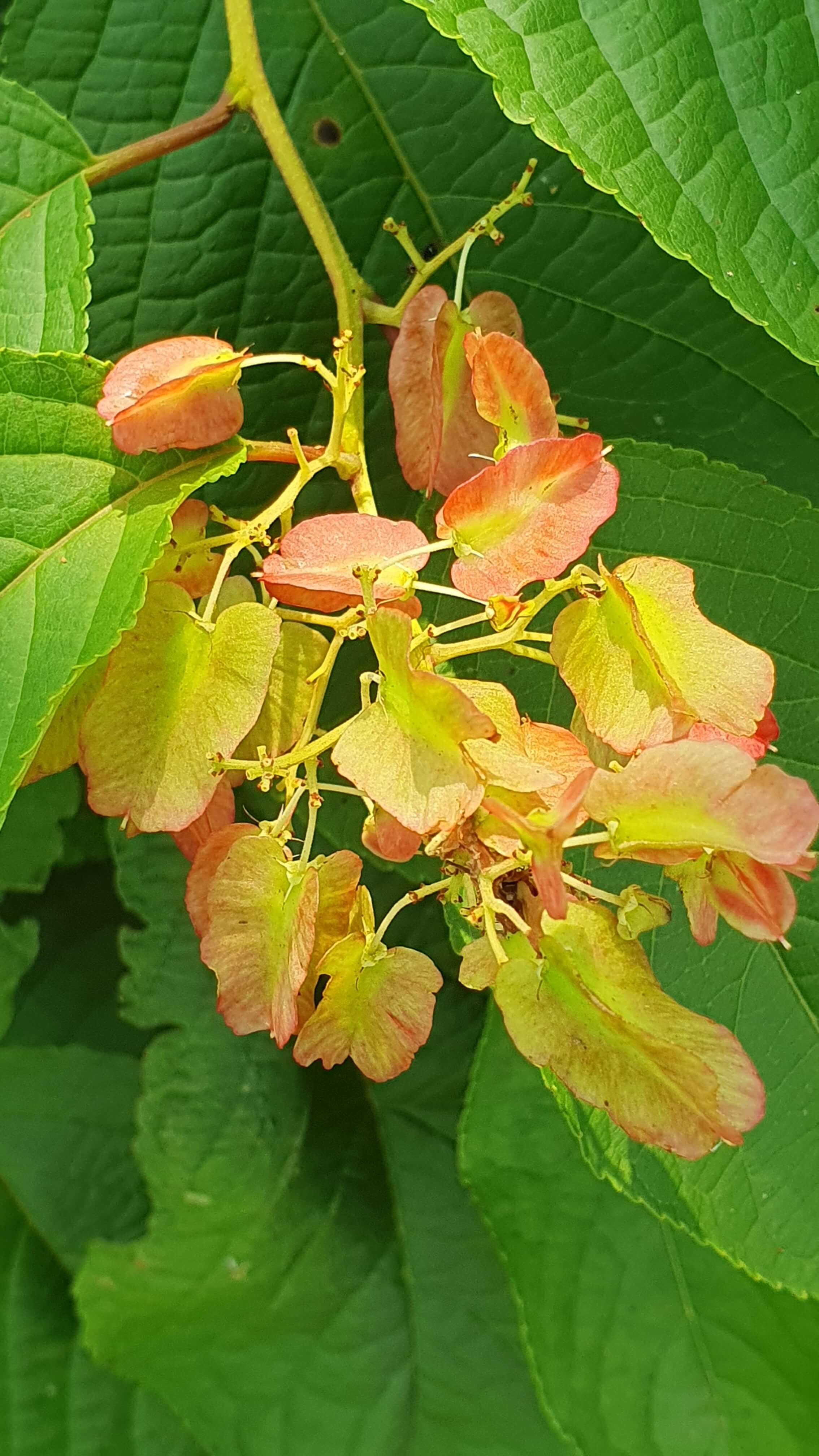 미역줄나무는 오밀조밀한 흰색 꽃보다 붉은 날개를 가진 열매가 더 화려하다.