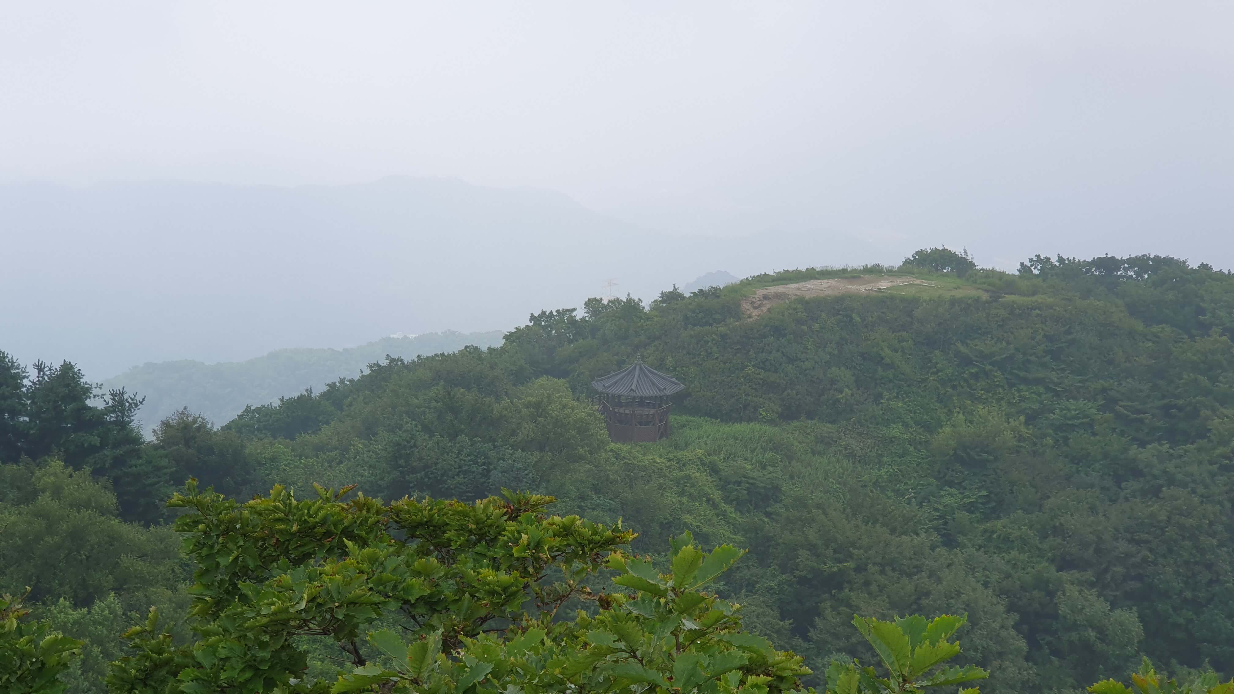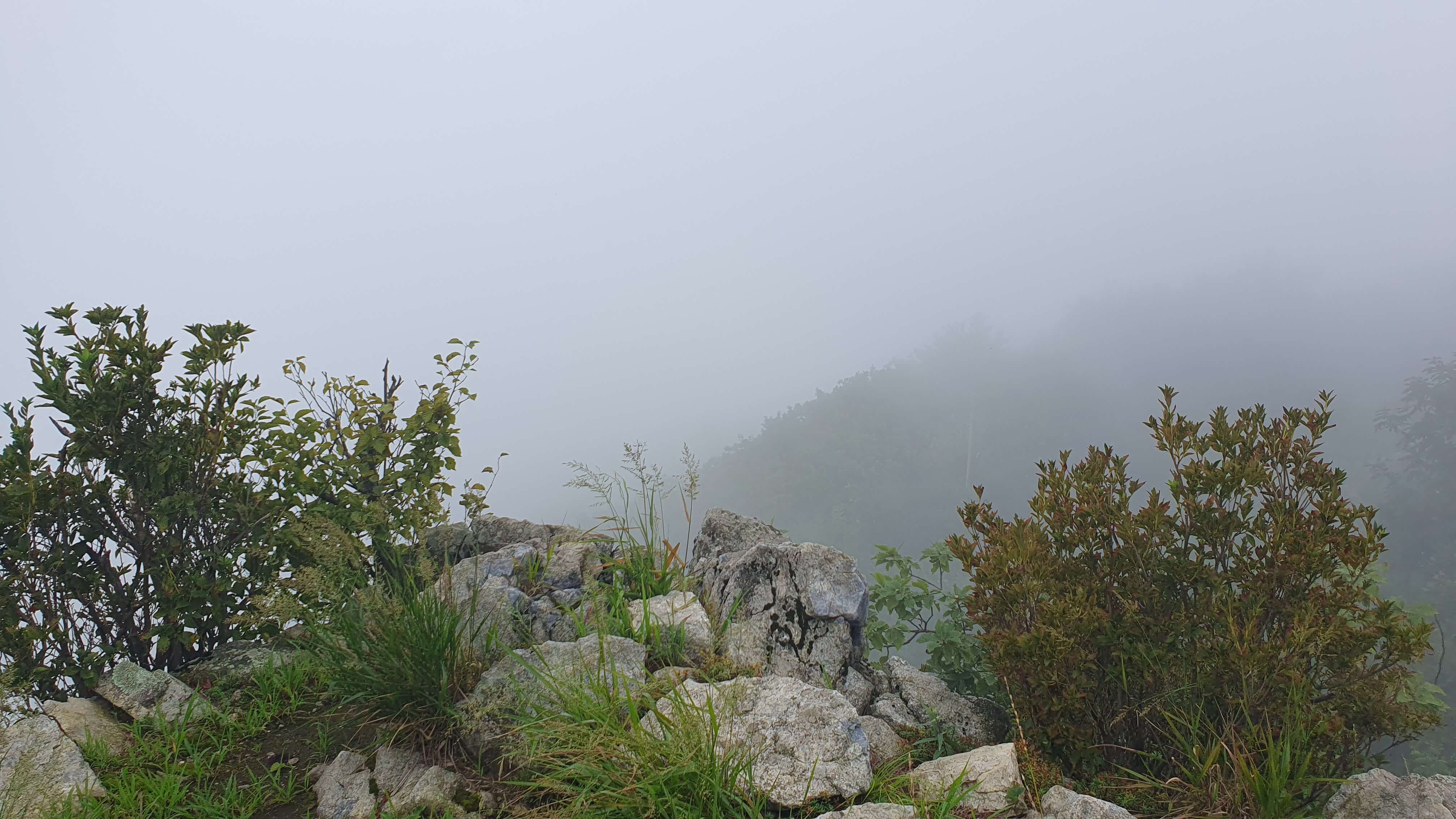 새벽에 내린 비로 안개가 자욱하여 주위를 조망할 수 없다.