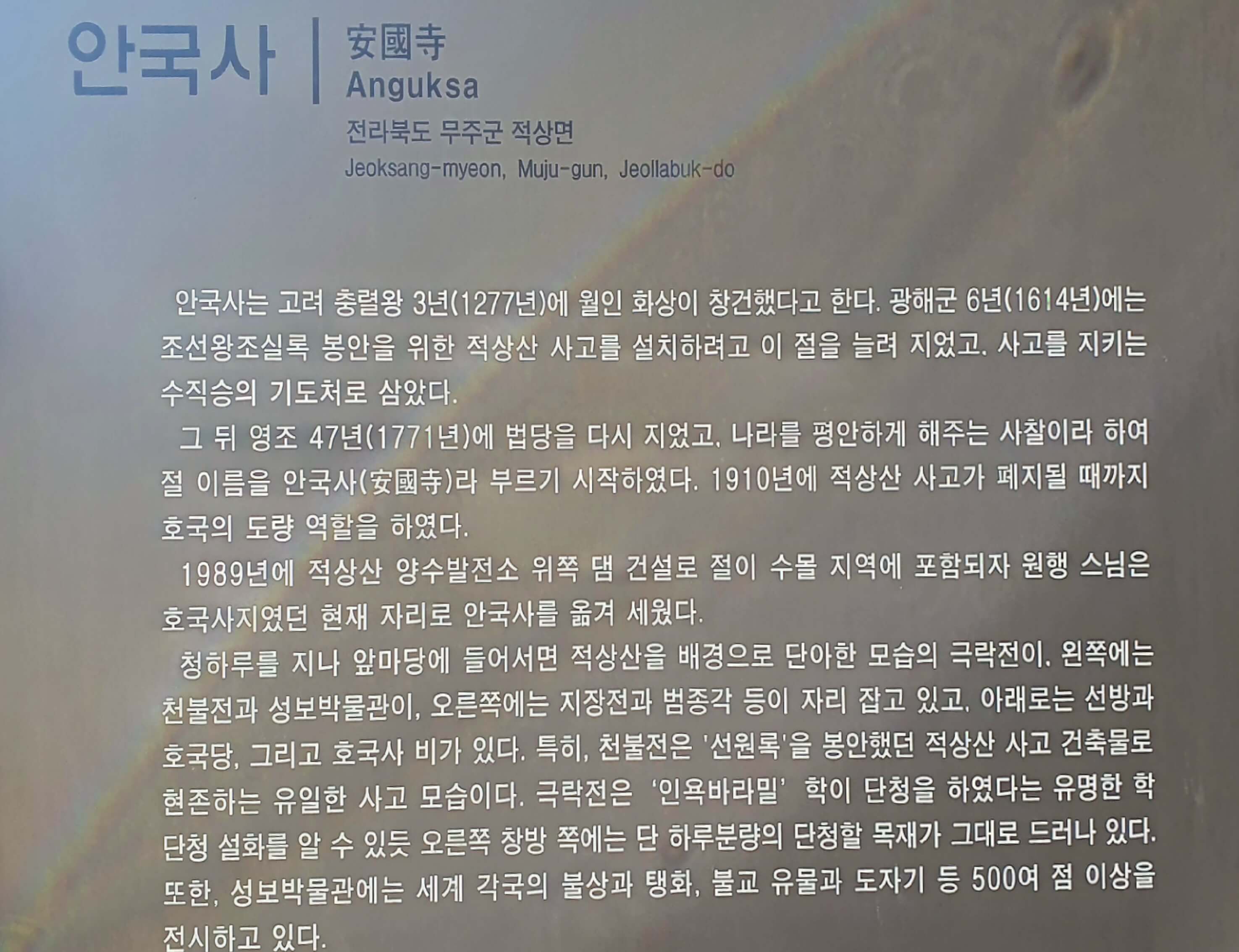 적상호를 왼쪽에 끼고 돌면 양수댐 전망대 가는 이정표도 나오고, 적상사고 안내 표지판도 나온다. 하산후에 들러 보기로 하고 계속 올라간다. 잠시후 안국사가 나온다.