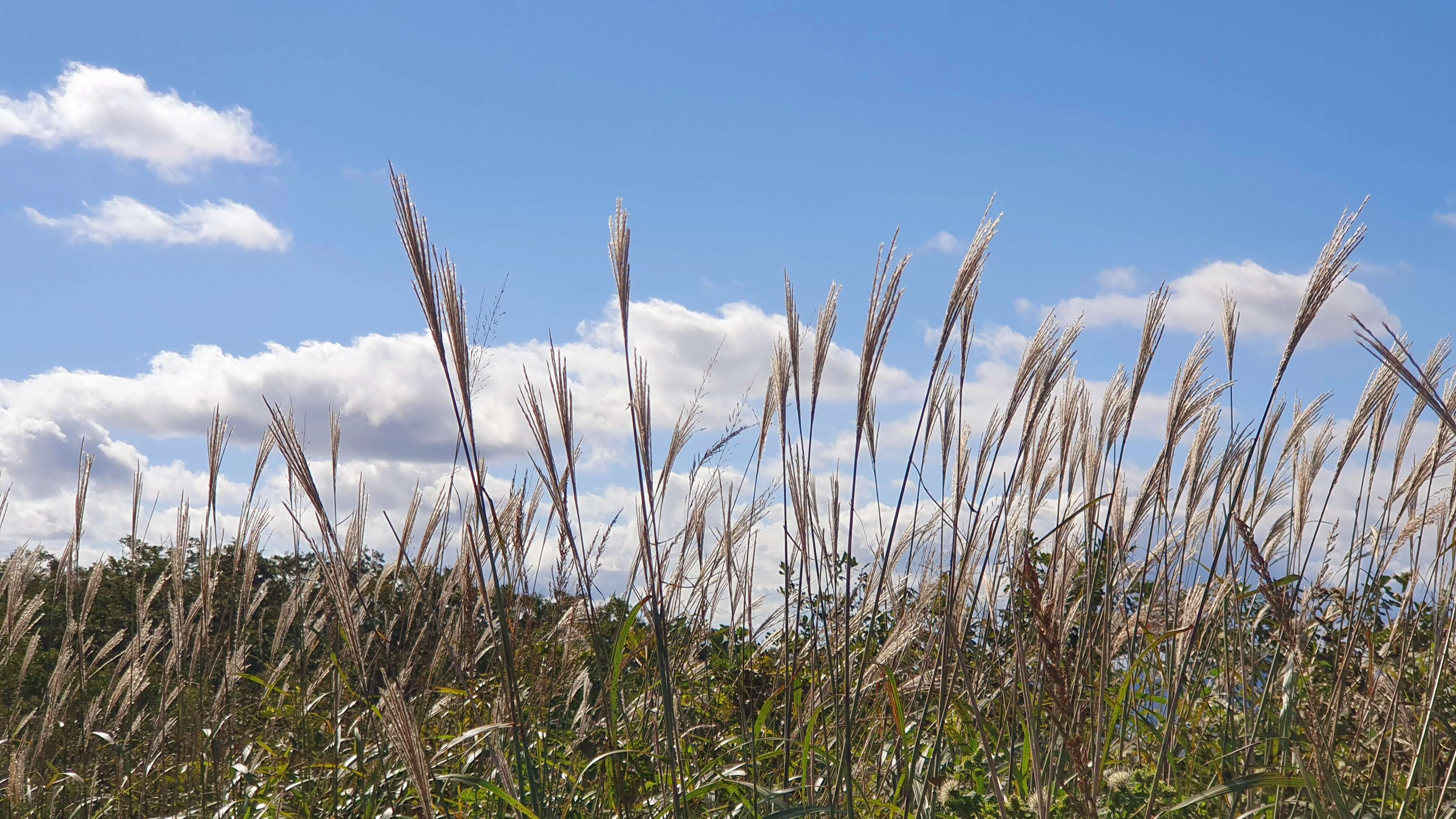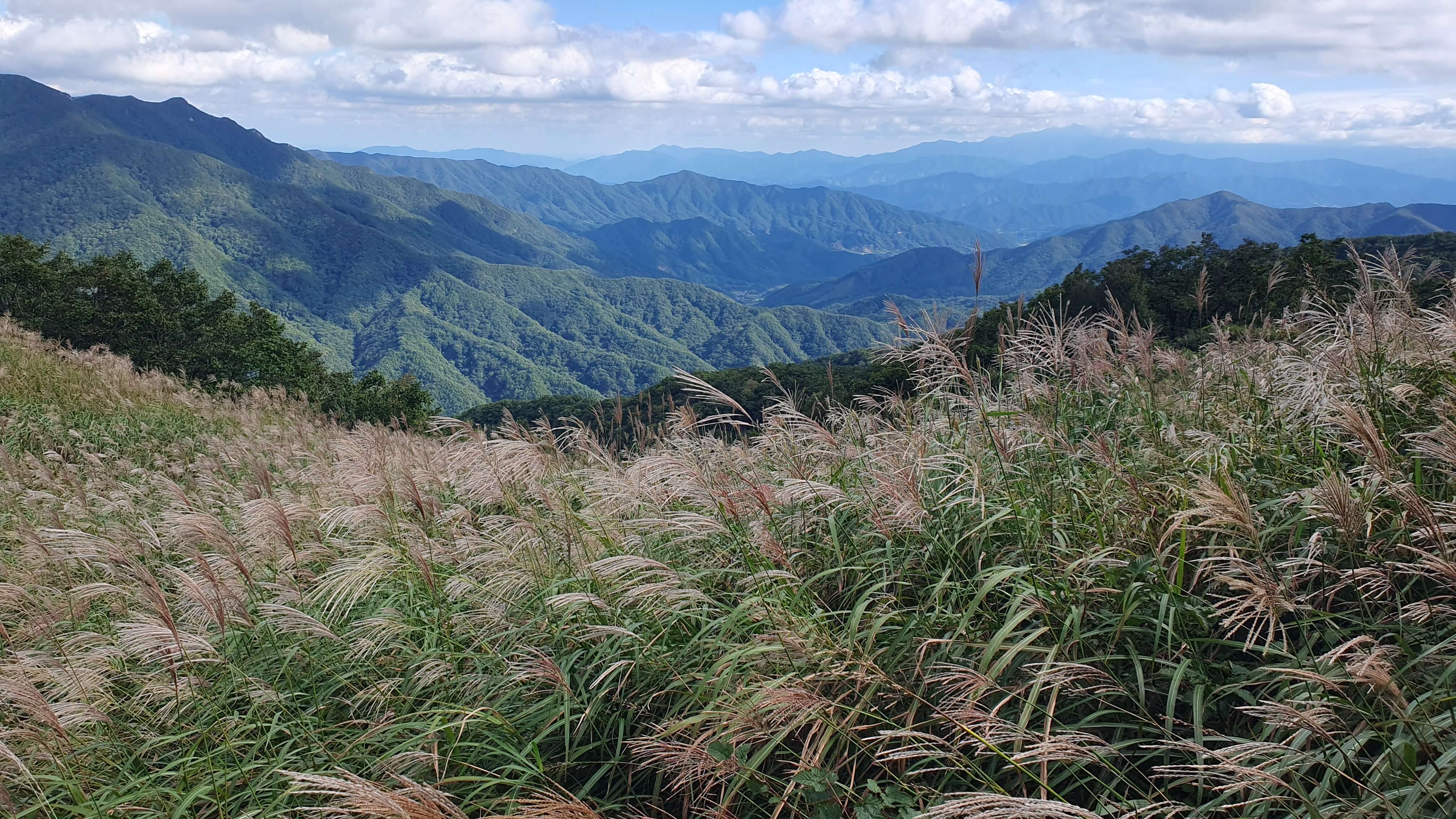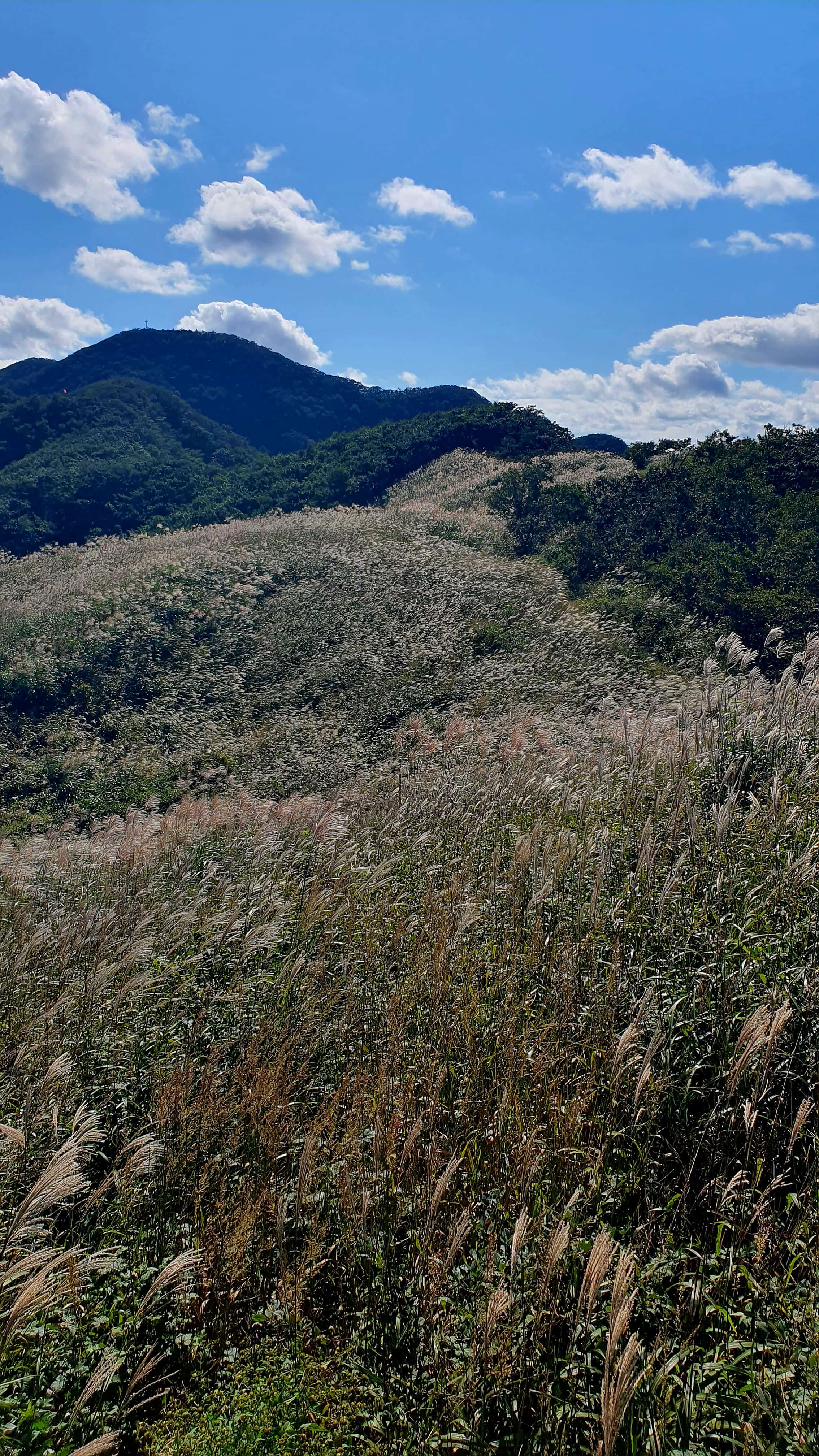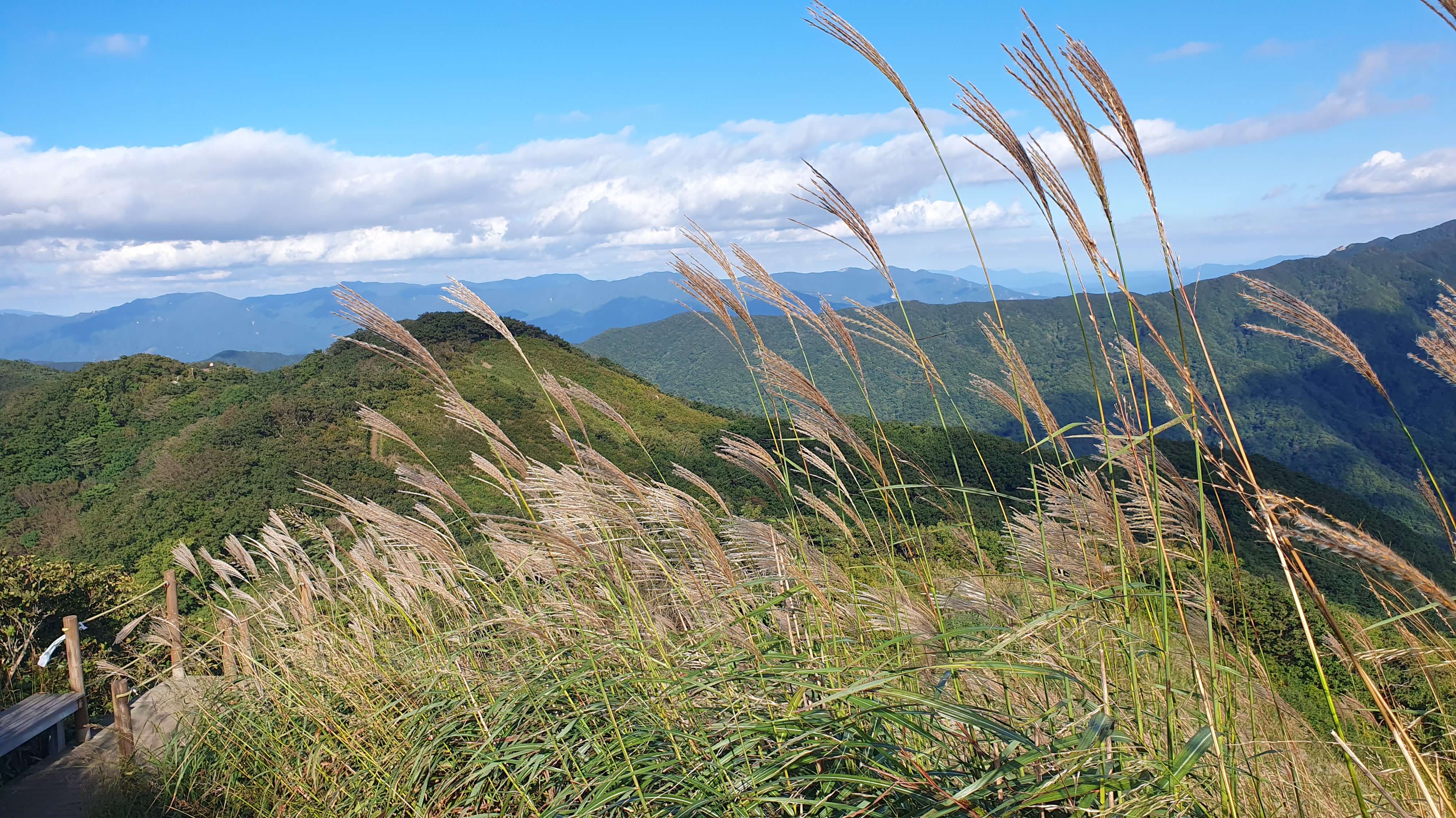 고개마루에 올라서자 달리 말로 표현하기 어려운 출렁이는 억새 평원이 펼쳐진다. 출렁이는 억새밭과 넘실대는 산능선, 파란 하늘, 흰 구름이 어루러져 장관을 연출한다.