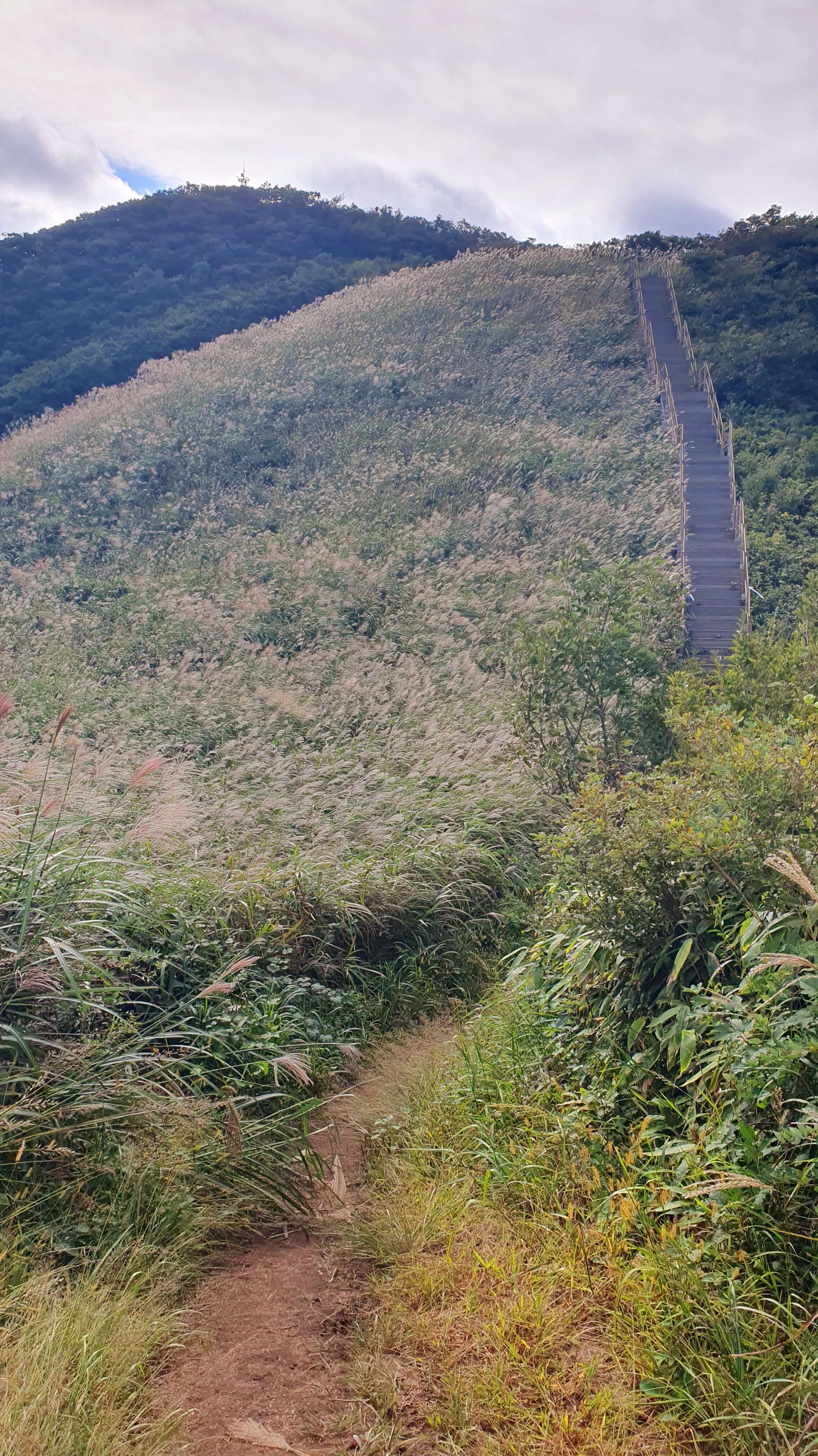 억새 평원에서 머지않은 거리에 있는 정상이 보인다. 정상 직전에 데크계단 옆으로 또 하나의 억새밭이 있다.