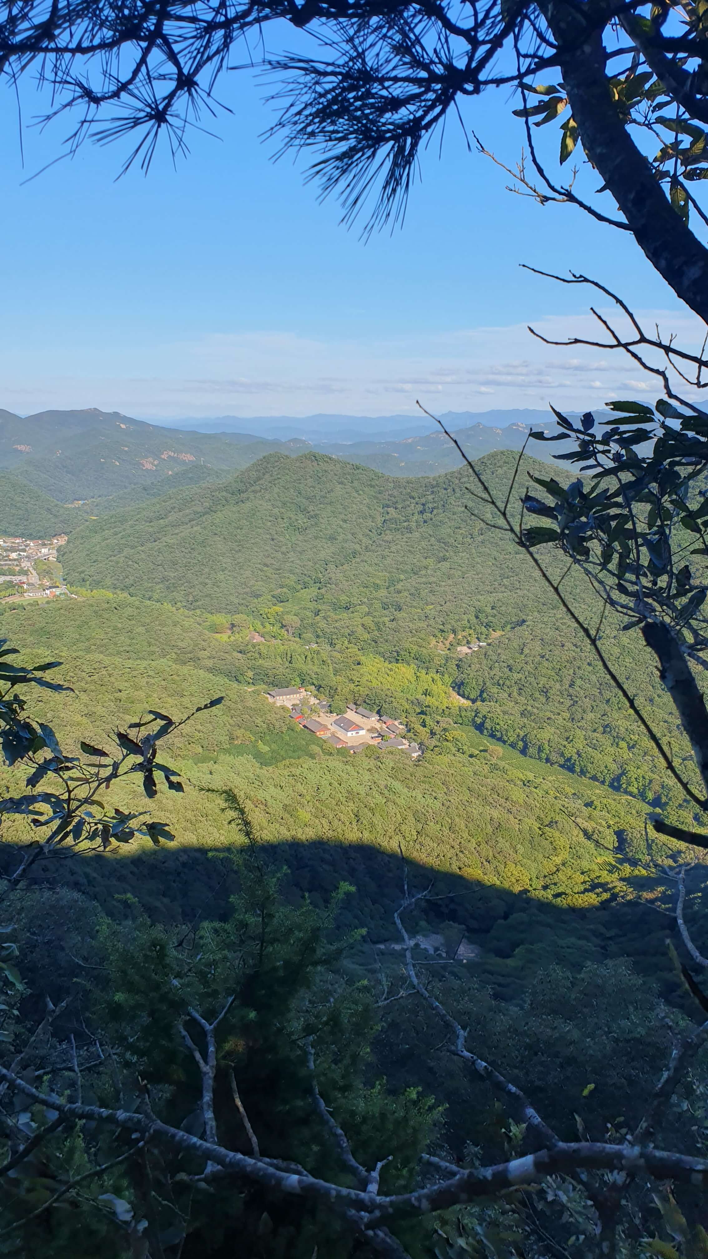 수리봉에서 보이는 선운사 전경. 오후 5시경 서해 바다로 해가 떨어 지면서 짙은 선운산 그림자를 드리우고 있다.