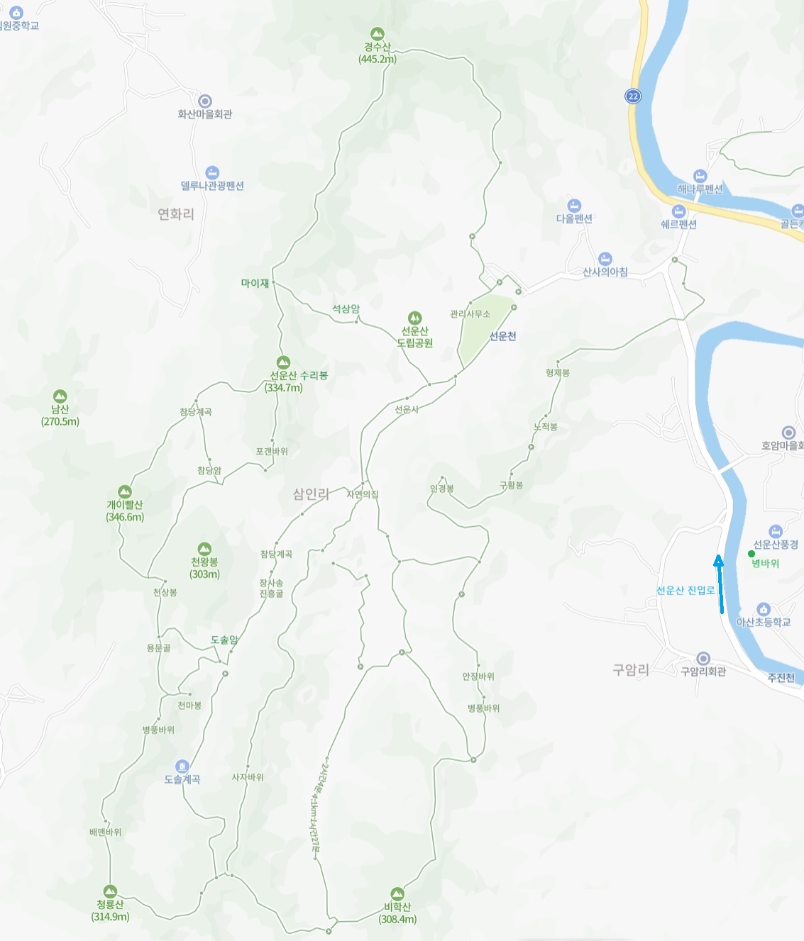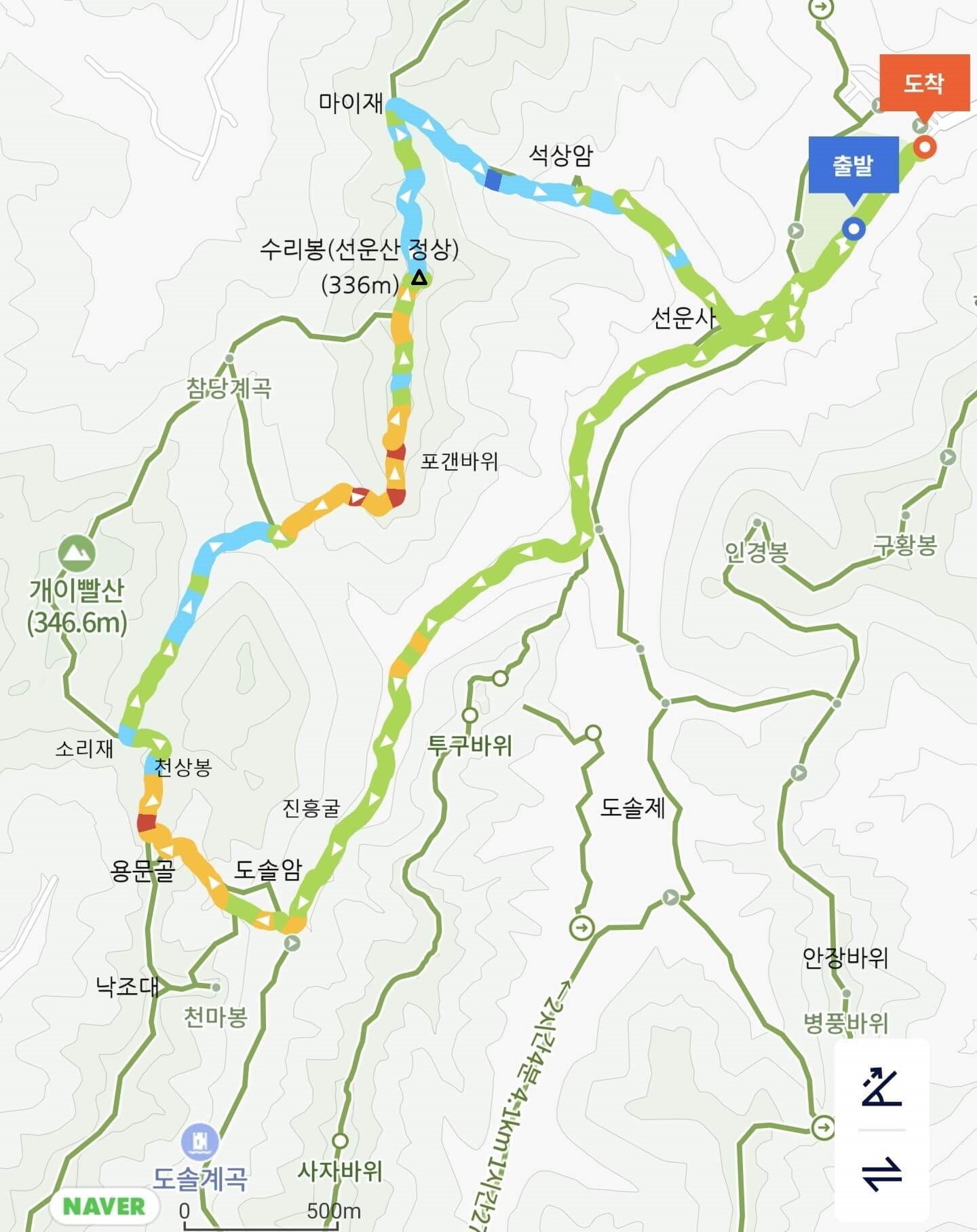- 산행경로 : 주차장 - 선운사앞 - 진흥굴 - 도솔암 - 용문굴 - 천상봉(265m) - 소리재 - 참당암 입구 - 포갠바위 - 수리봉(정상 336m) - 마이재 - 석상암 - 선운사 옆 - 주차장